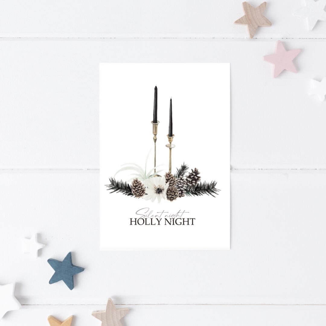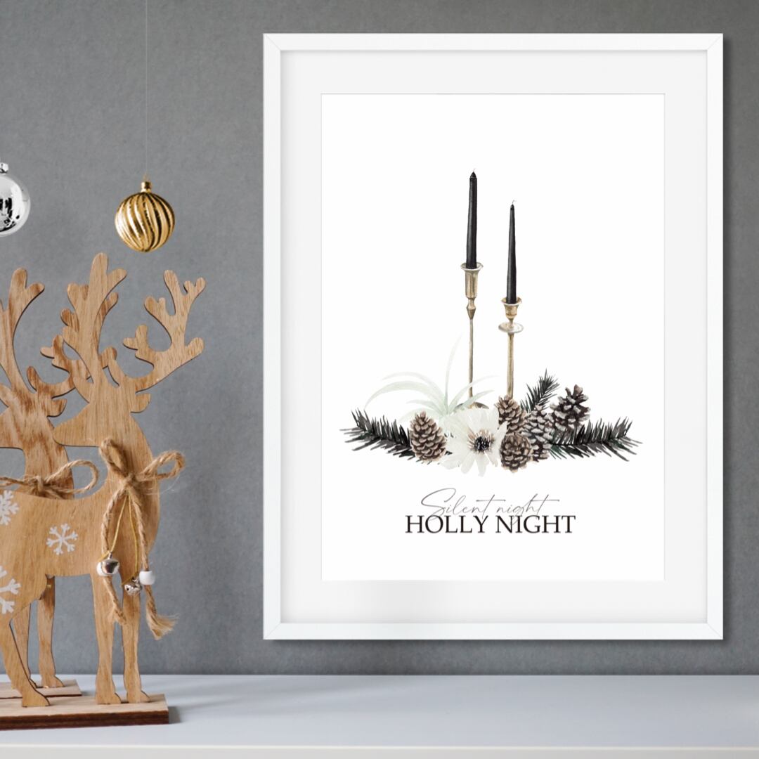 モノトーンクリスマスシリーズから、キャンドルホルダーのアレンジメントのポスターです。「Silent night holly night 」と英字が入っています。