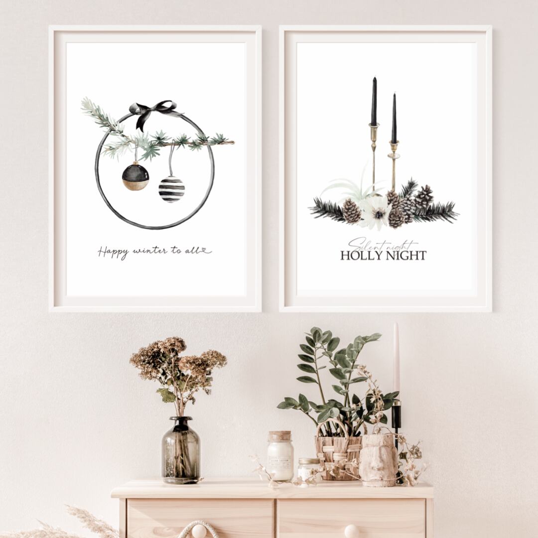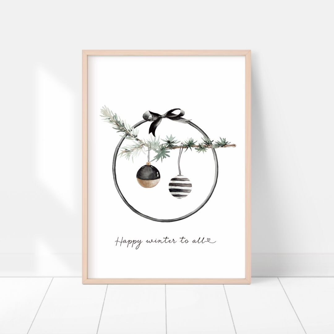モノトーンクリスマスシリーズから、リース&オーナメントのポスターです。「Happy winter to all」と英字が入っています。
