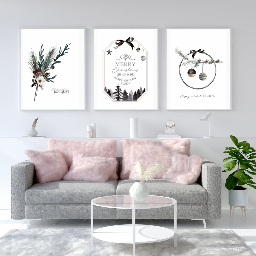モノトーンクリスマスシリーズから、森のフレームポスターです。「Merry Christmas and Happy New Year」と英字が入っています。