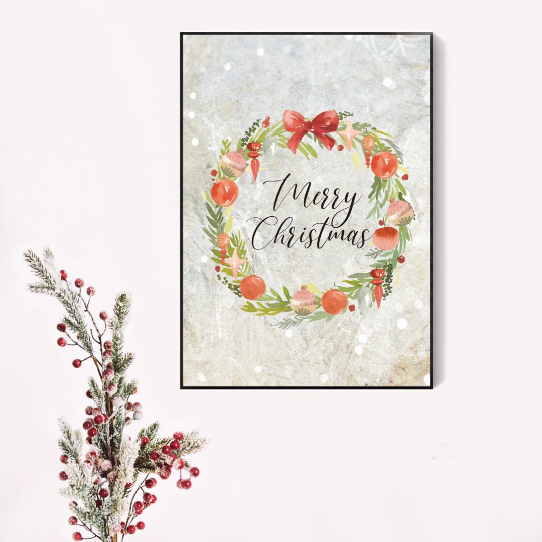 「クリスマスの風景」シリーズから、クリスマスリースのポスターです。もみの木のリースに赤を中心としたオーナメントが飾り付けられています。