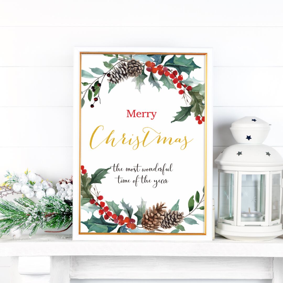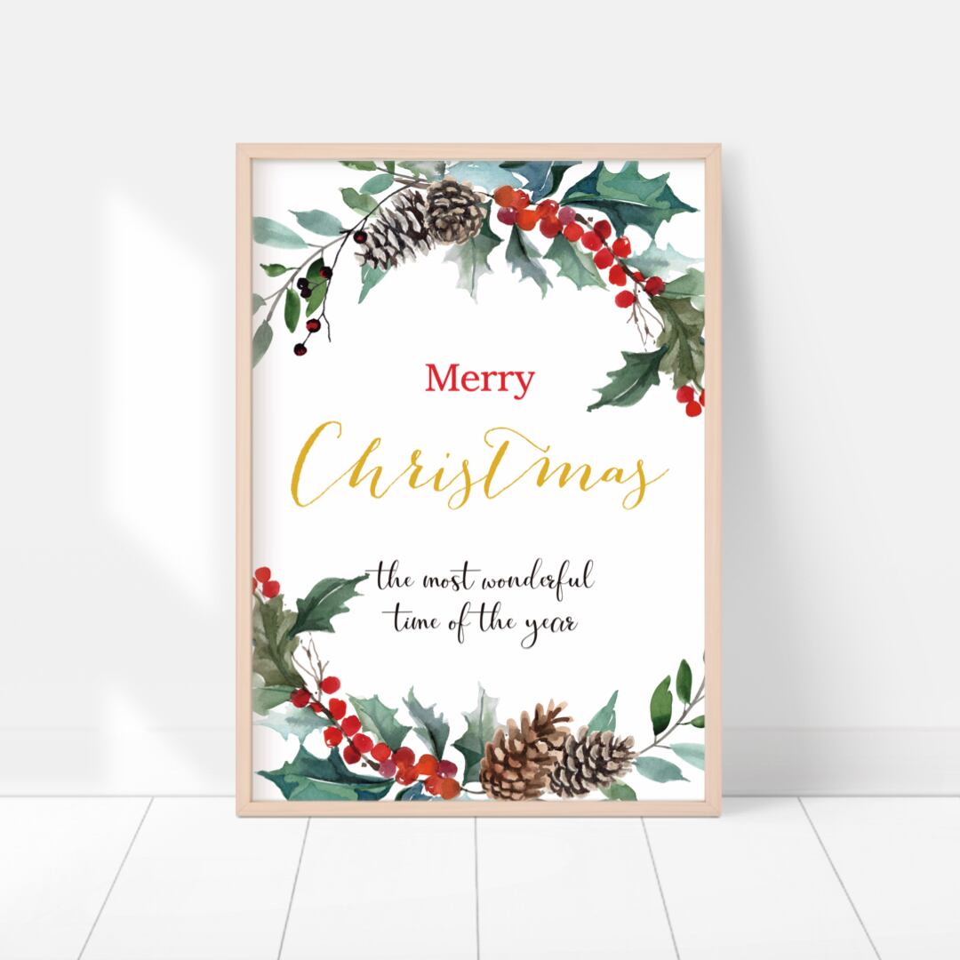 クリスマスの植物シリーズから、ガーランドのポスターです。クリスマスの時期ならではの、ヒイラギや赤い実、松かさなどをガーランドにしたものをリースのように飾り、華やかさを出しました。