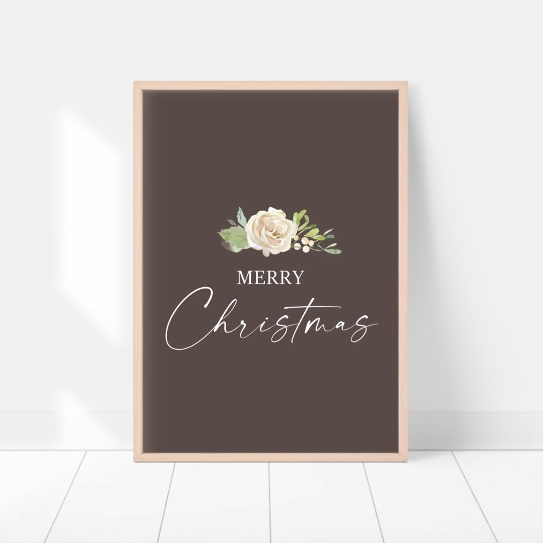 クリスマスの植物ポスターシリーズから、白バラと英字のポスターです。チャコールグレーの下地に、白バラとヤドリギ、Christmasの文字をあしらいました。大人っぽくシックな印象です。