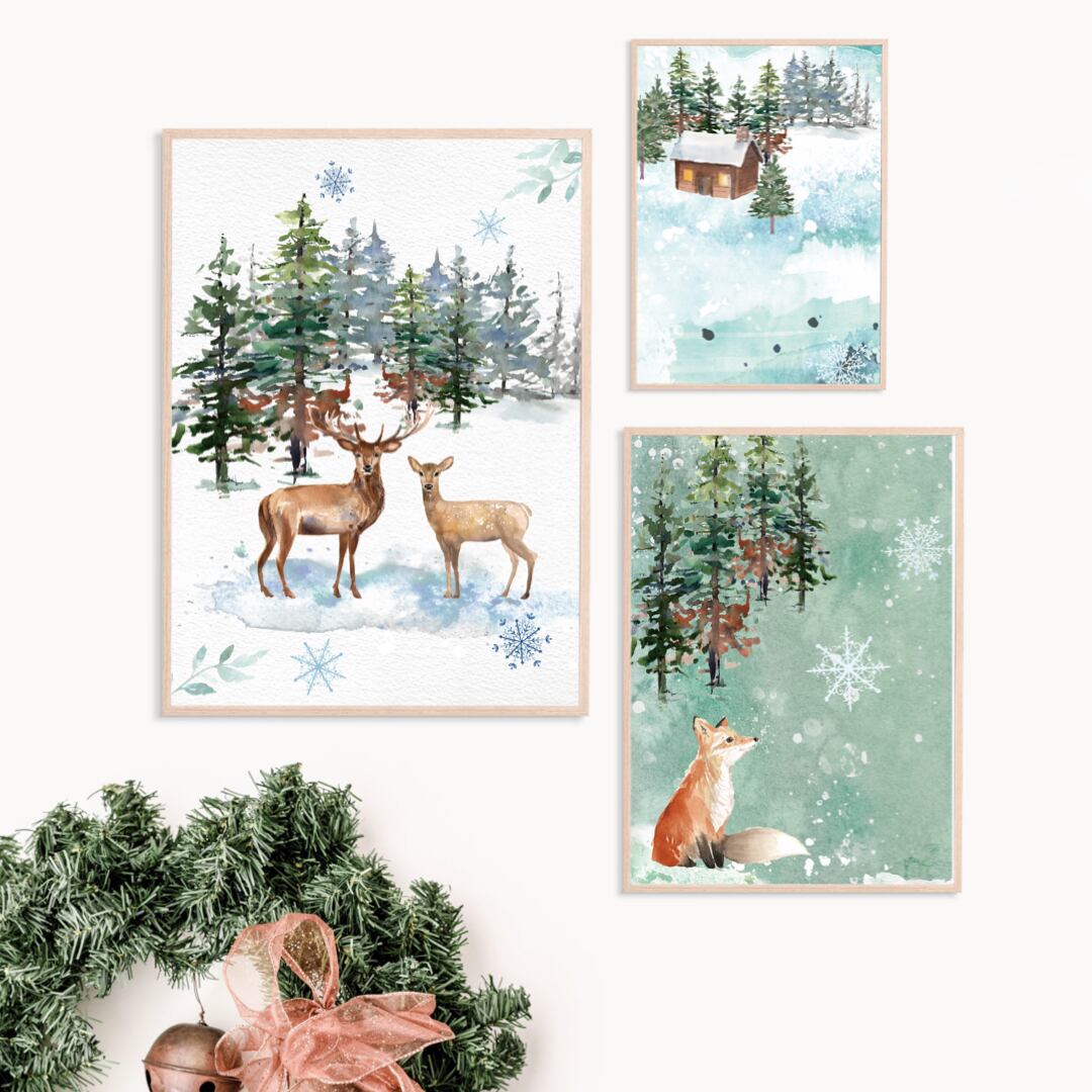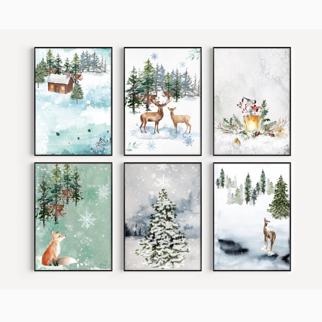 雪景色が広がる風景のポスターです。森や山、湖にたたずむ動物たち。静寂と心地よさ、美しい冬が感じられるポスターです。