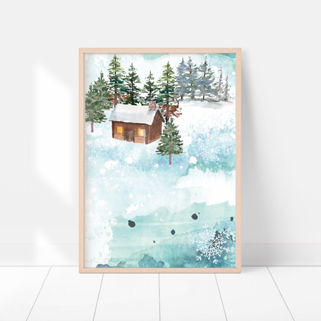 雪景色が広がる風景のポスターです。森や山、湖にたたずむ動物たち。静寂と心地よさ、美しい冬が感じられるポスターです。