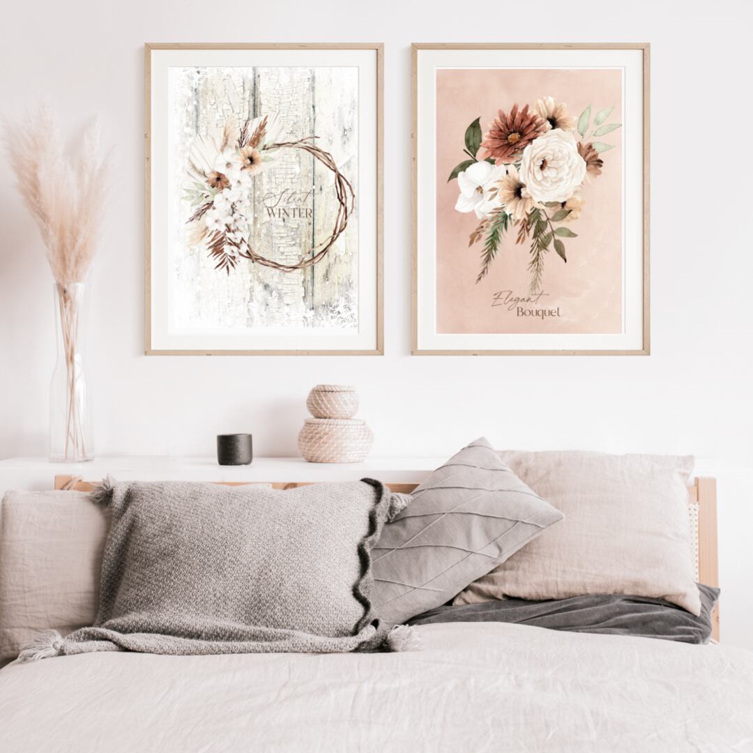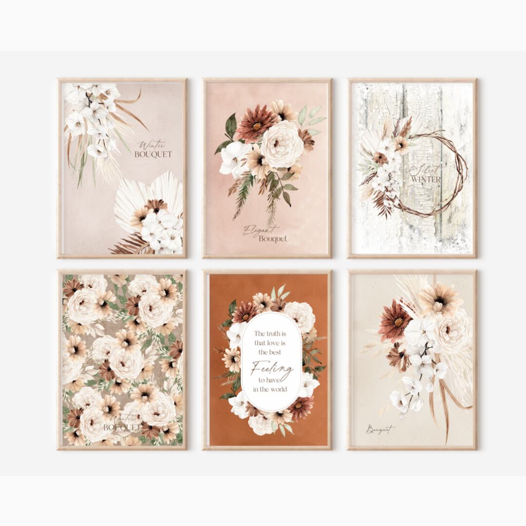 ベージュと白を基調とした花や葉を使った、ブーケやリース、フレーム飾りのポスターです。寒い冬の中でも温かみが感じられます。