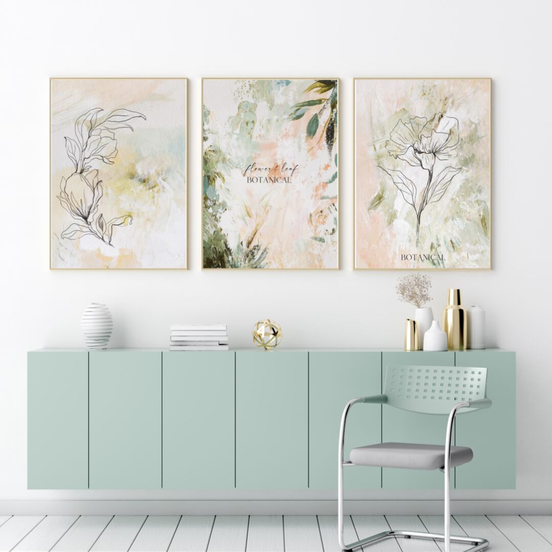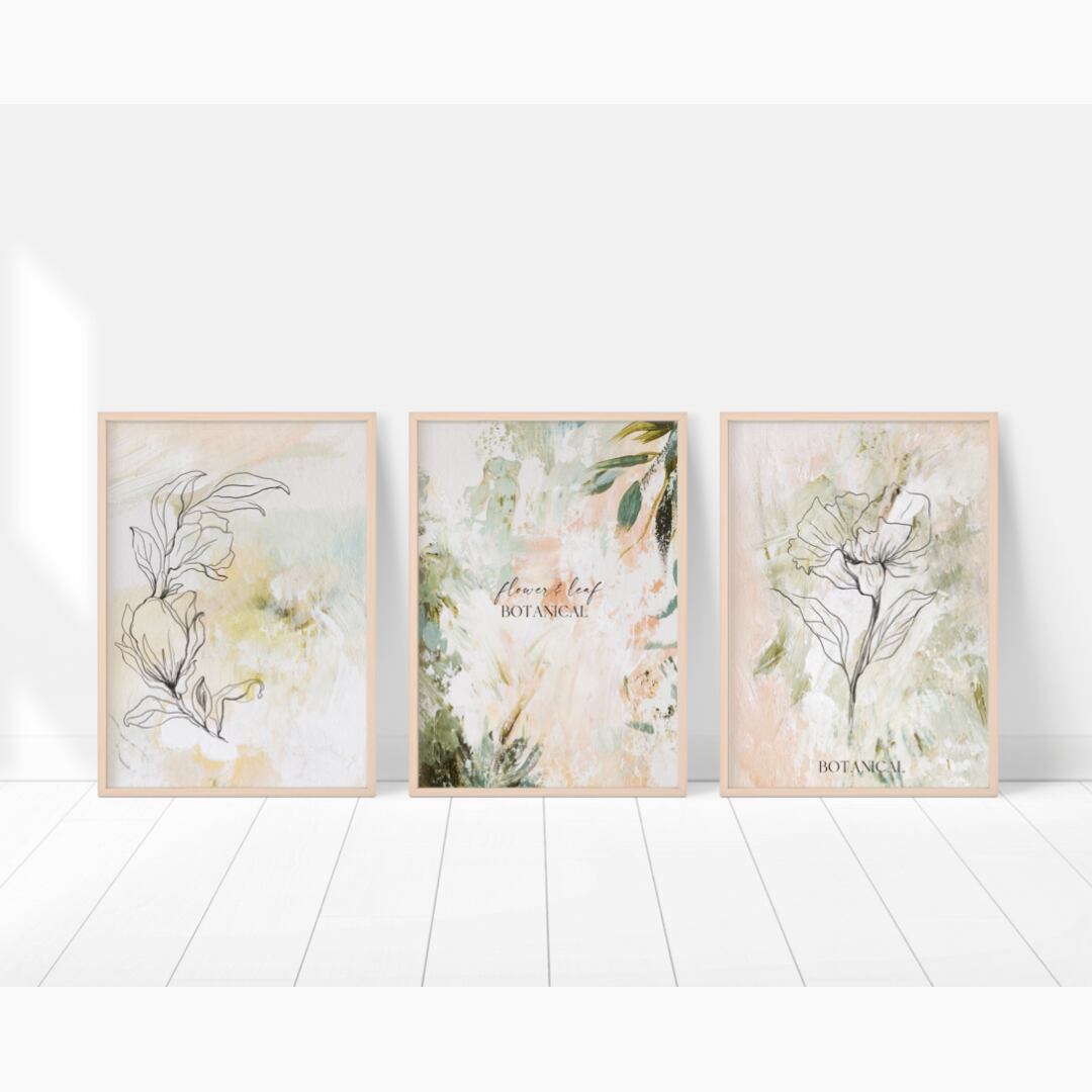 今回ご紹介するのは、白を基調にグリーンや淡いピンク、水色の筆のタッチを重ねた上に、花や葉などのボタニカルな絵をあしらった、とても春らしい爽やかさのあるポスターです。