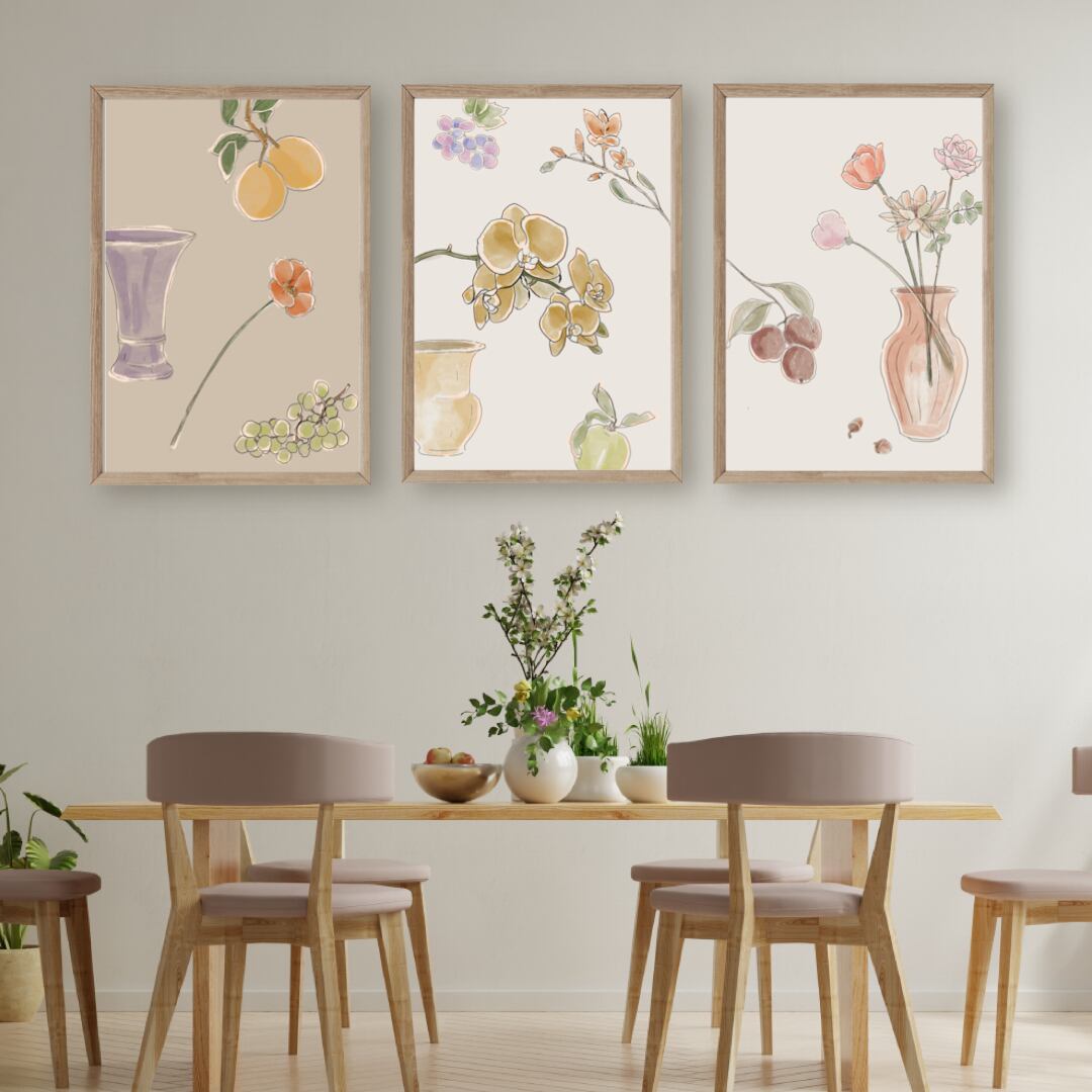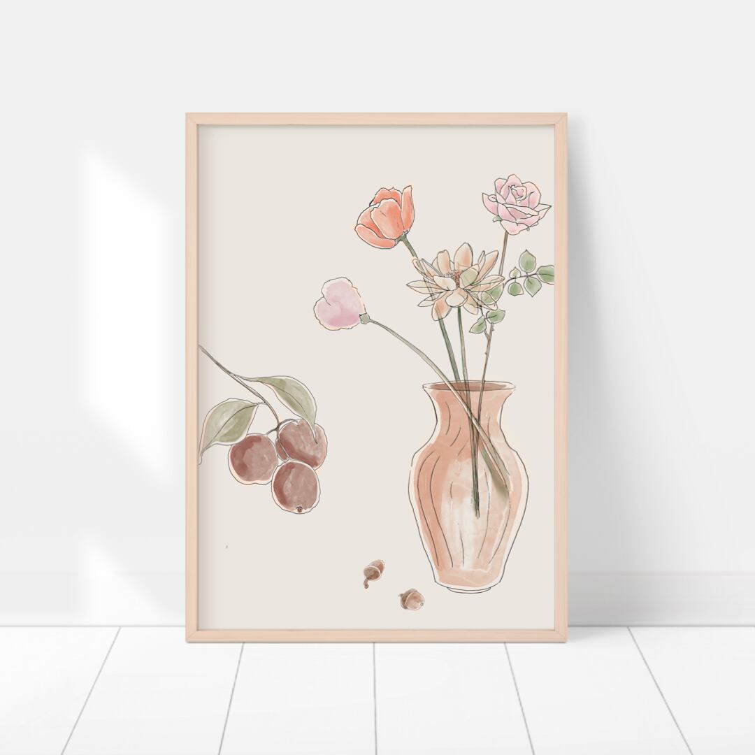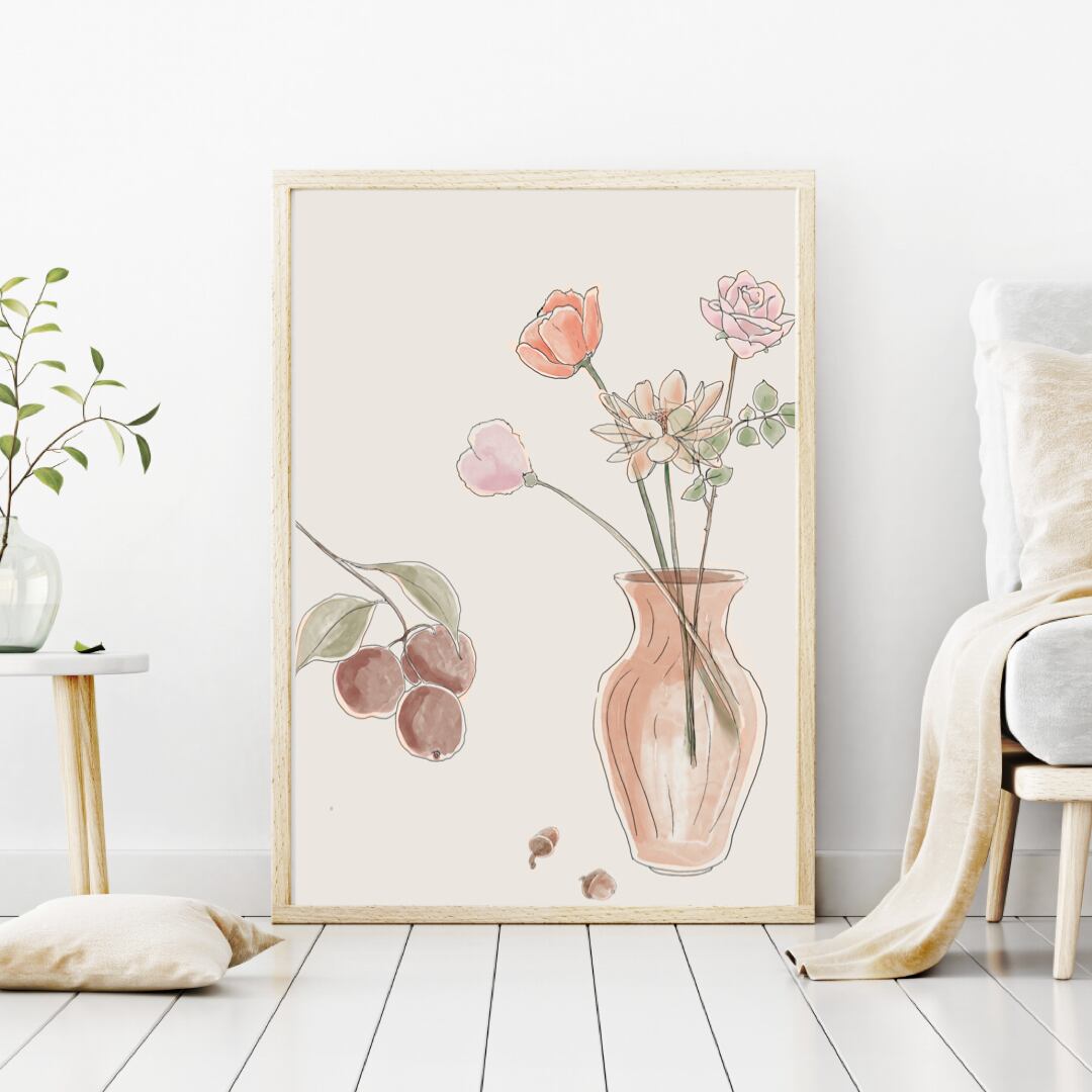 こちらは、コチョウランなどの花や花瓶、フルーツを取り入れたアートポスターです。水彩タッチで描かれていて、背景もナチュラルなベージュを使っているので、ナチュラルで優しく、明るい印象に仕上がりました。