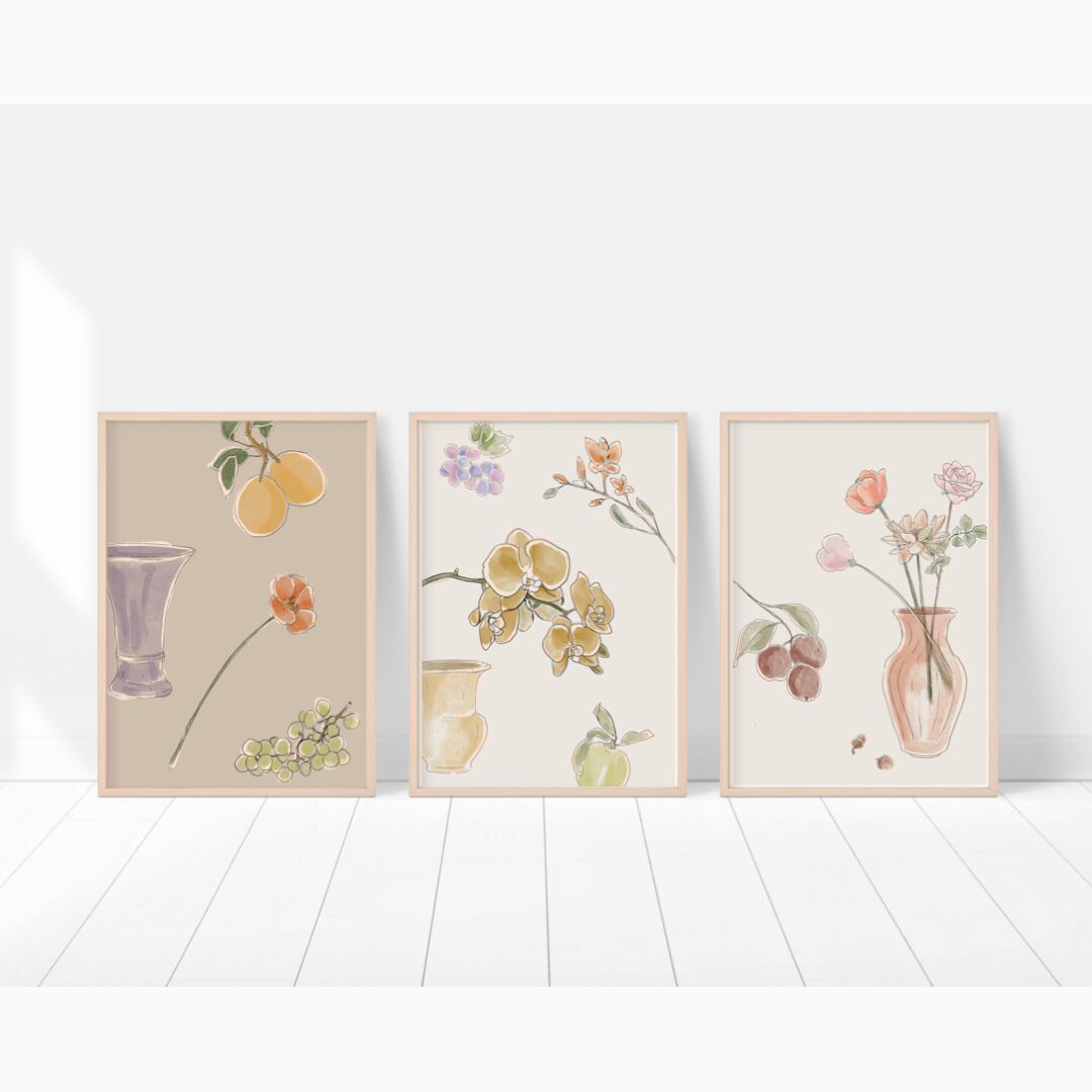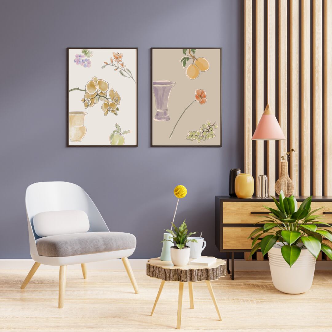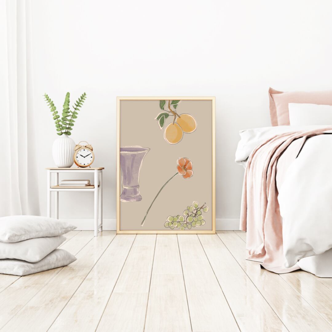 こちらは、コチョウランなどの花や花瓶、フルーツを取り入れたアートポスターです。水彩タッチで描かれていて、背景もナチュラルなベージュを使っているので、ナチュラルで優しく、明るい印象に仕上がりました。