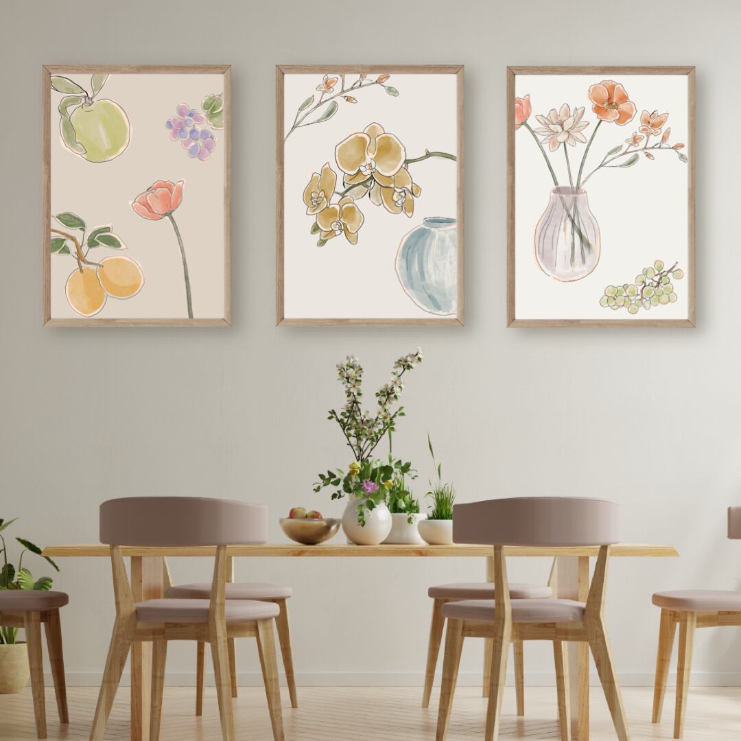 こちらは、コチョウランなどの花や花瓶、フルーツを取り入れたアートポスターです。水彩タッチで描かれていて、背景もナチュラルなベージュを使っているので、ナチュラルで優しく、明るい印象に仕上がりました。