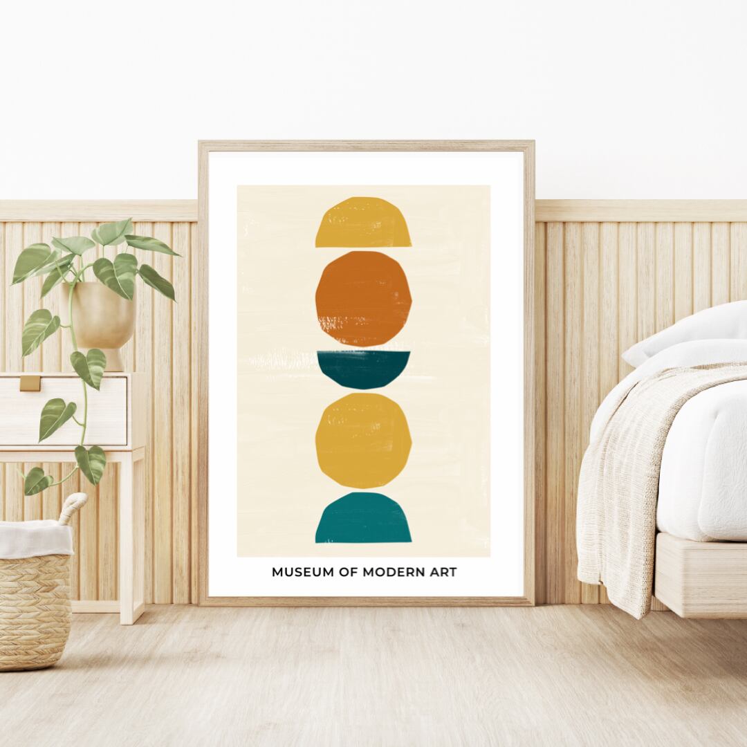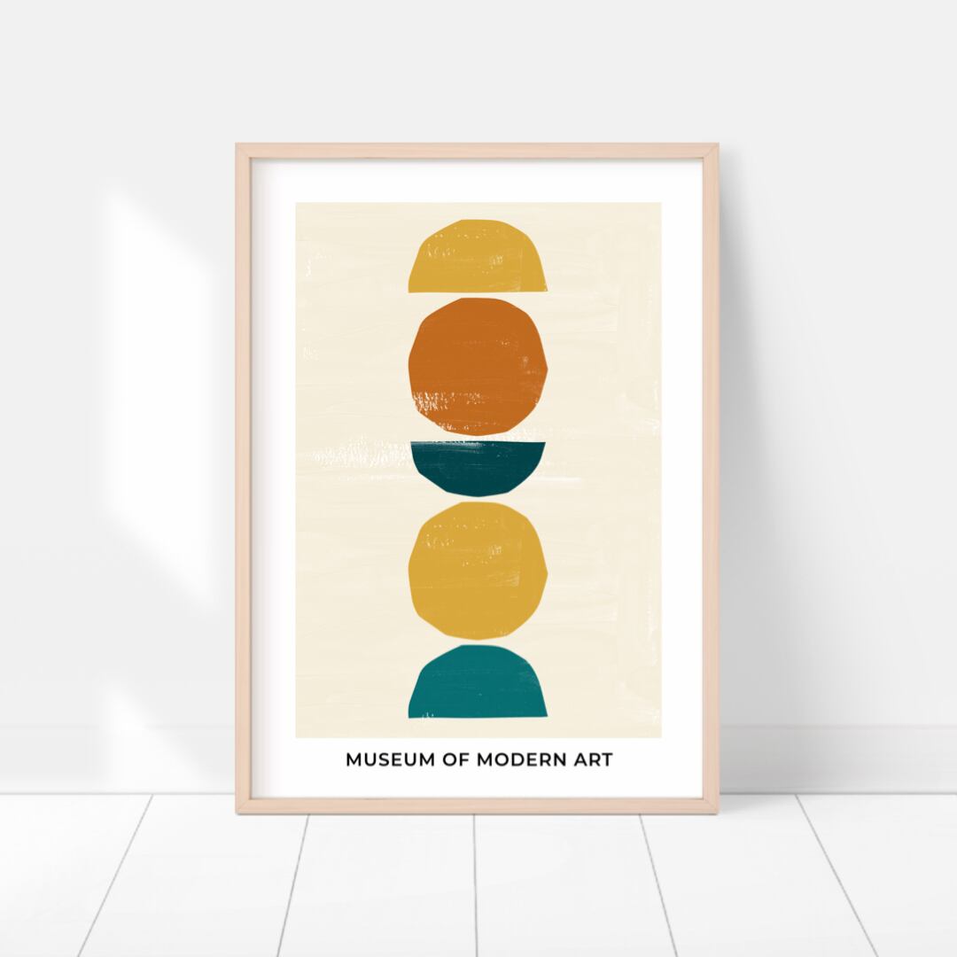 こちらは、マスタード色、オレンジ色、ターコイズ色、ベージュのレトロな色合いのモダンアートです。月のモチーフや幾何学模様など、飽きの来ないデザインです。