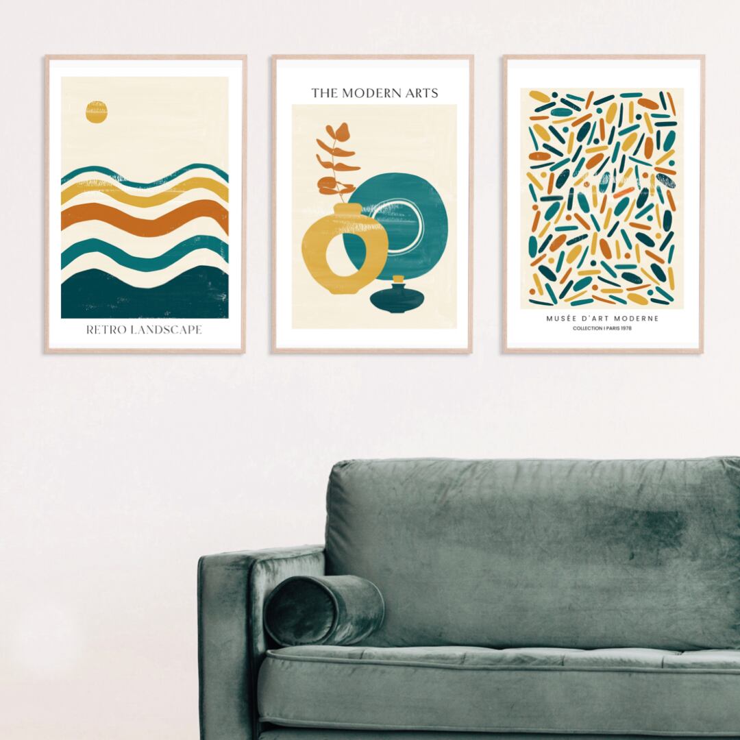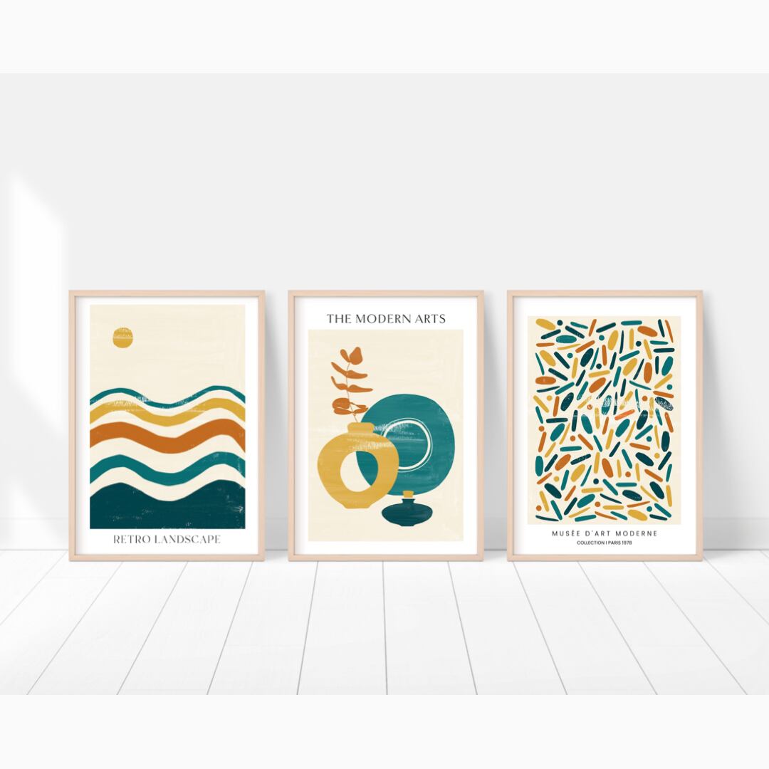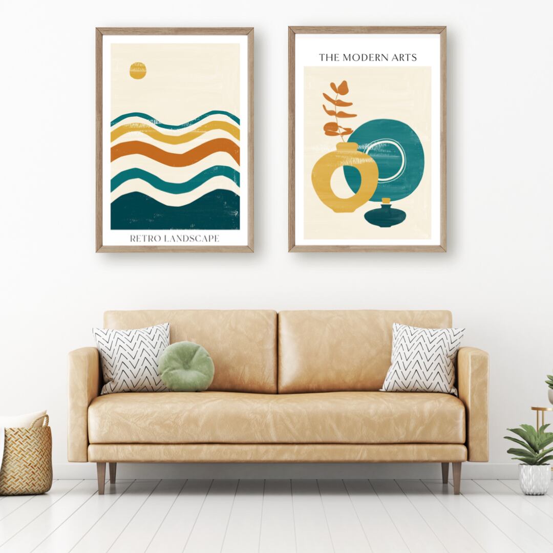 こちらは、マスタード色、オレンジ色、ターコイズ色、ベージュのレトロな色合いのモダンアートです。月のモチーフや幾何学模様など、飽きの来ないデザインです。