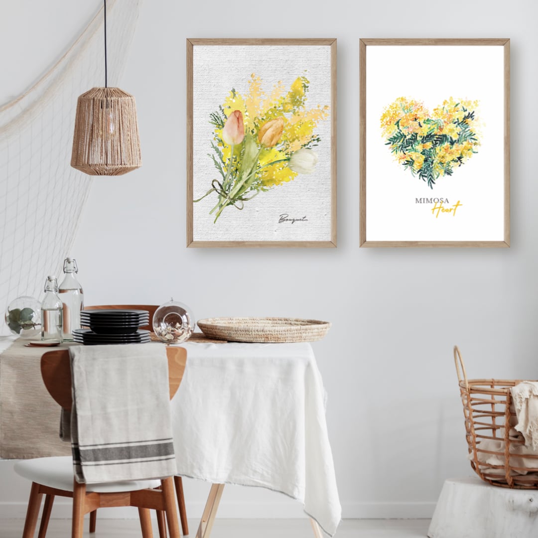 ミモザをモチーフにして、リースやスワッグなど、さまざまなタイプのポスターを作ってみました。