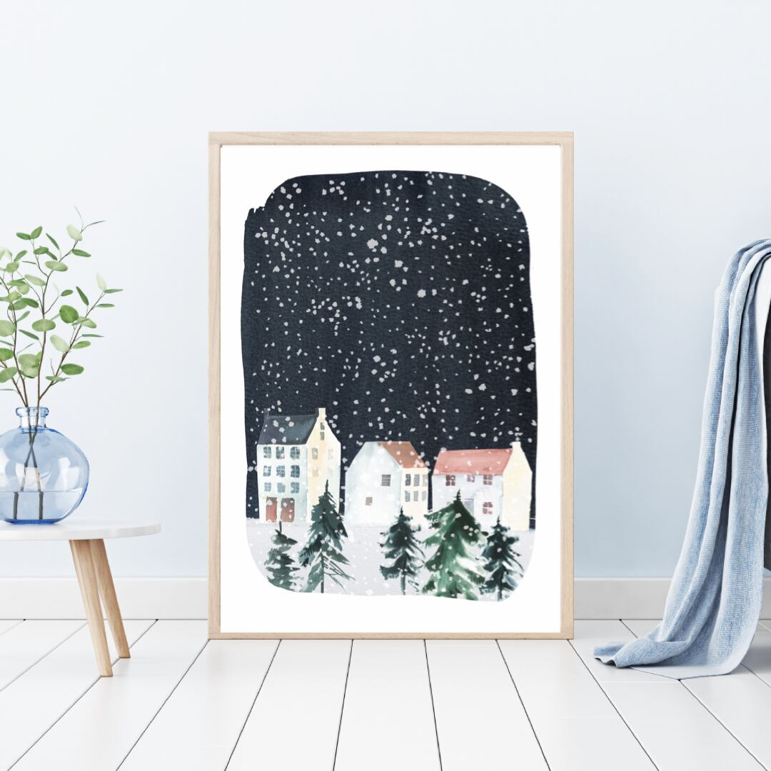 冬の夜を背景に、家や人々、森やオーロラなどの冬景色が描かれたポスターです。静がで心が落ち着くような美しい景色と共に、冬の夜を過ごしてみませんか。