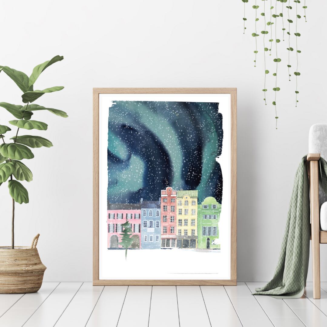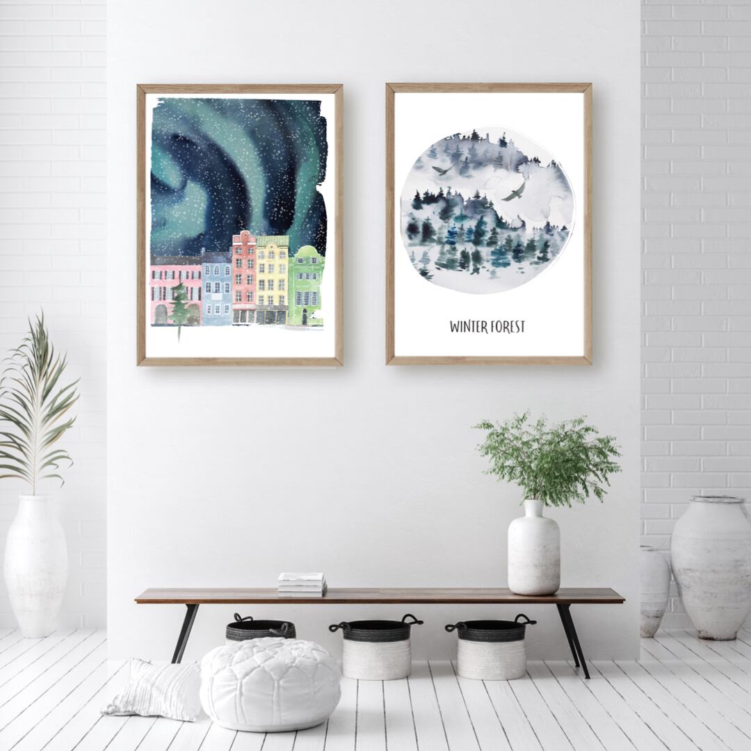冬の夜を背景に、家や人々、森やオーロラなどの冬景色が描かれたポスターです。静がで心が落ち着くような美しい景色と共に、冬の夜を過ごしてみませんか。