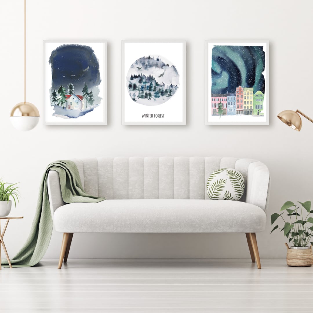 冬の夜を背景に、家や人々、森やオーロラなどの冬景色が描かれたポスターです。静がで心が落ち着くような美しい景色と共に、冬の夜を過ごしてみませんか。