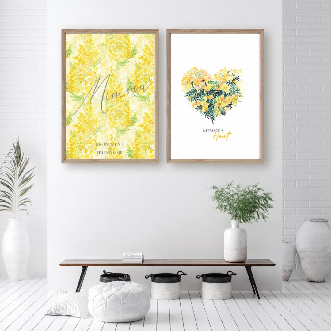 ミモザをモチーフにして、リースやスワッグなど、さまざまなタイプのポスターを作ってみました。