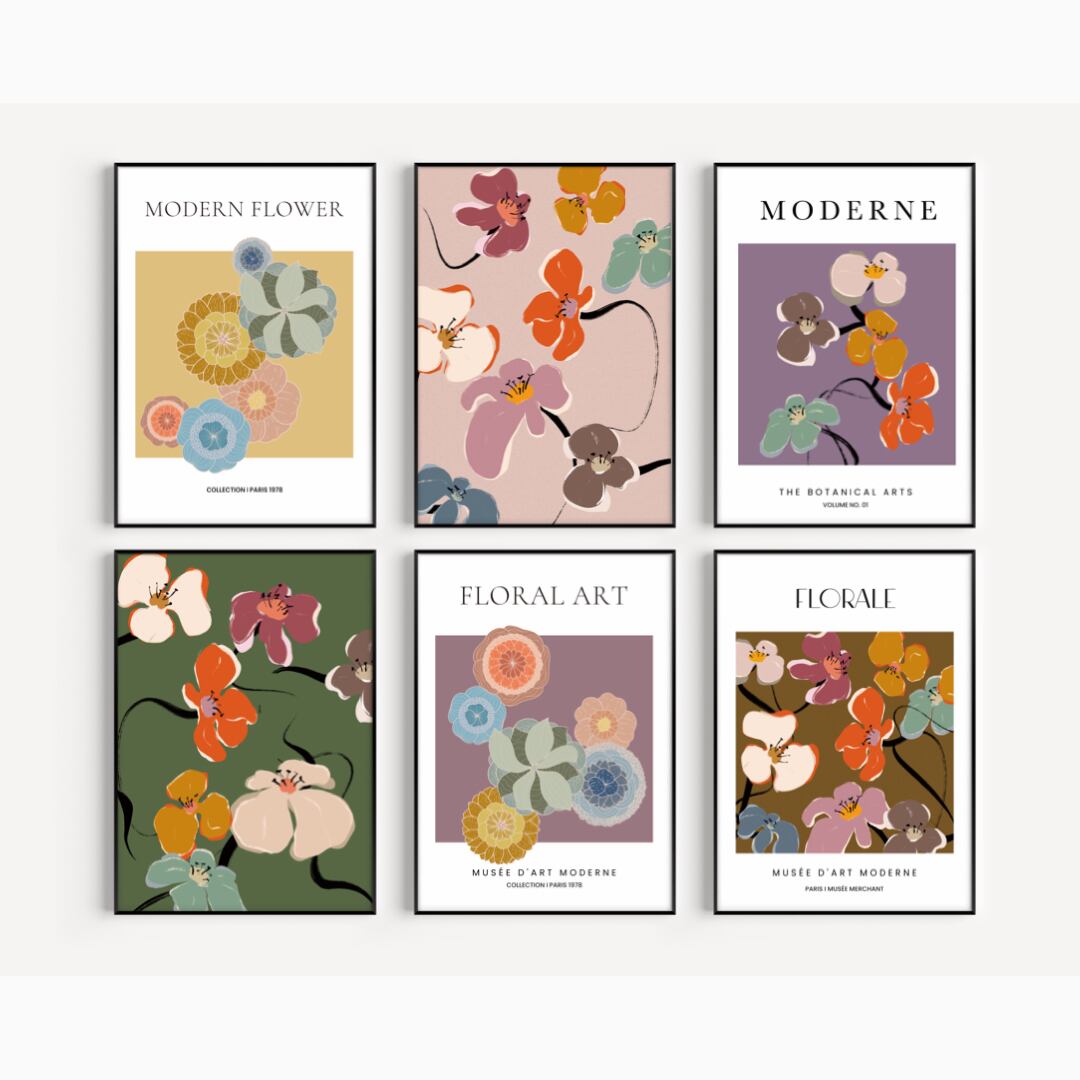 新春にぴったりな、色とりどりの花のポスターです。くすんだ紫やマスタード色、抹茶色を背景にして、和モダンなテイストに仕上げました。カラフルな花がインテリアを明るく彩ってくれます。