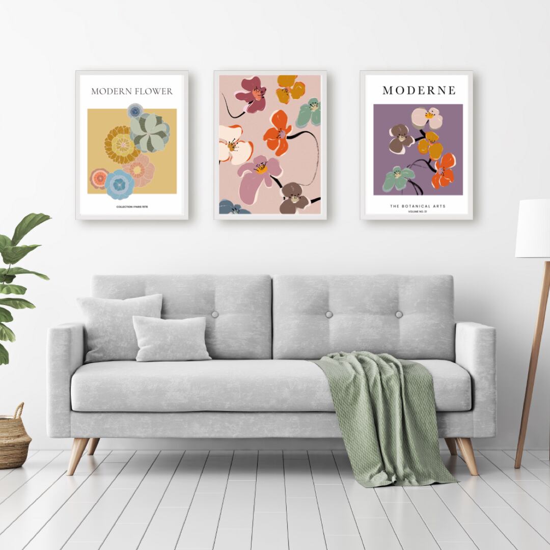 新春にぴったりな、色とりどりの花のポスターです。くすんだ紫やマスタード色、抹茶色を背景にして、和モダンなテイストに仕上げました。カラフルな花がインテリアを明るく彩ってくれます。