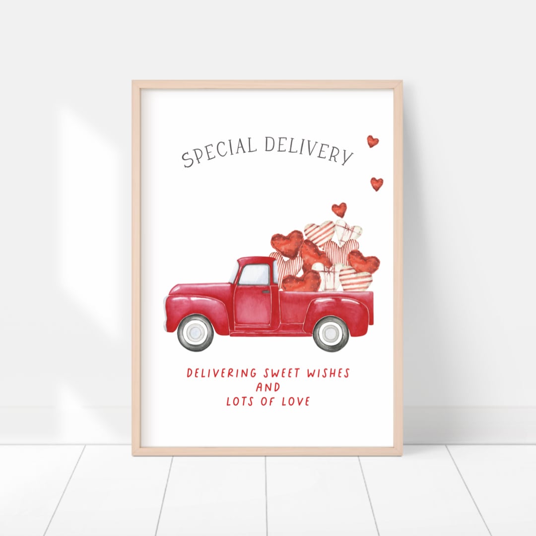 優しいタッチのピンクのワゴン、ハート形の風船やお花を乗せた車、赤いハートをたくさん積み込んだトラックなど、バレンタインにぴったりなおしゃれなアートポスターです。