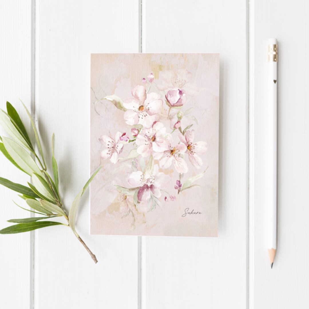 ボタニカル調の桜は色を淡くして、優しい印象に仕上げました。背景が、淡いピンク、グリーン、ブルーの3色を使用しています。