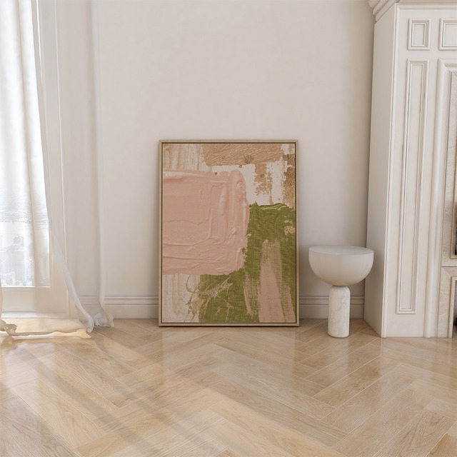 淡いピンクとグリーンでペイントされた抽象画です。全面に絵柄があるタイプと、キャンバス地を背景に小さめに抽象画が描かれているタイプがあります。春の草花を思わせる明るい色合いです。