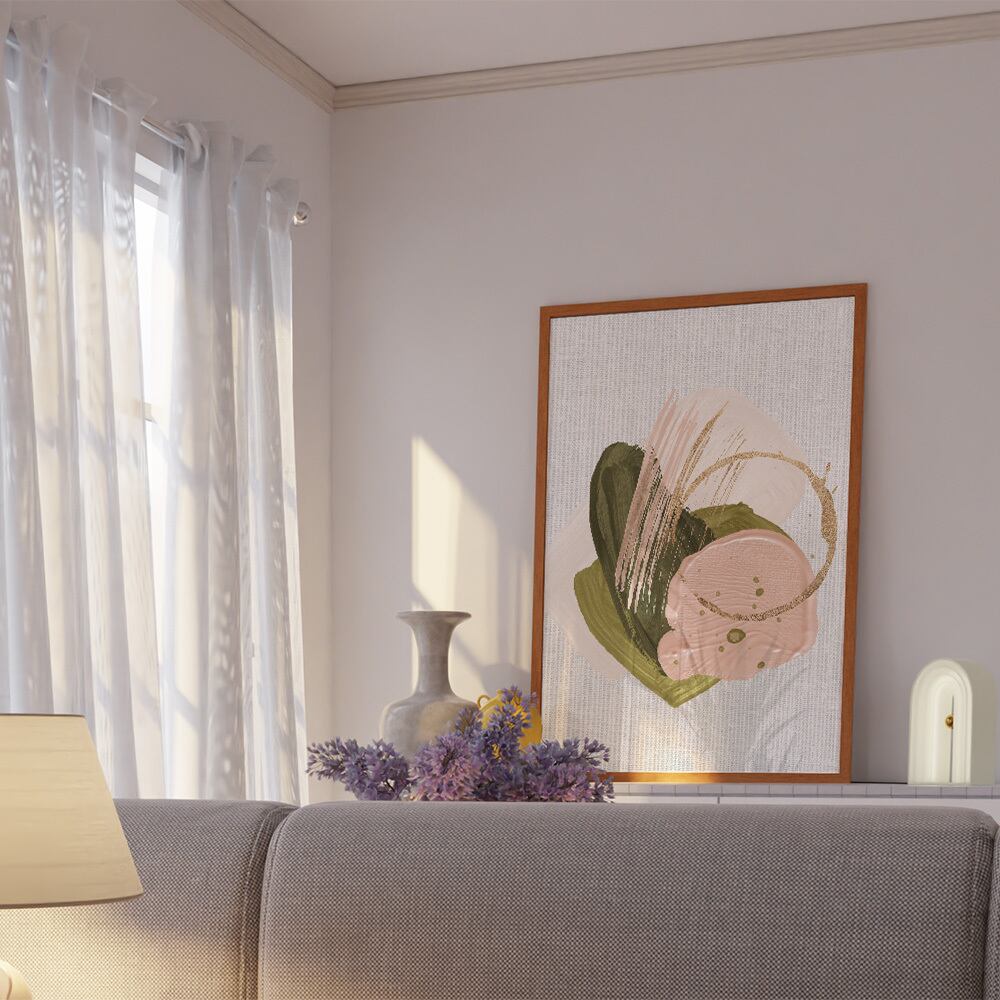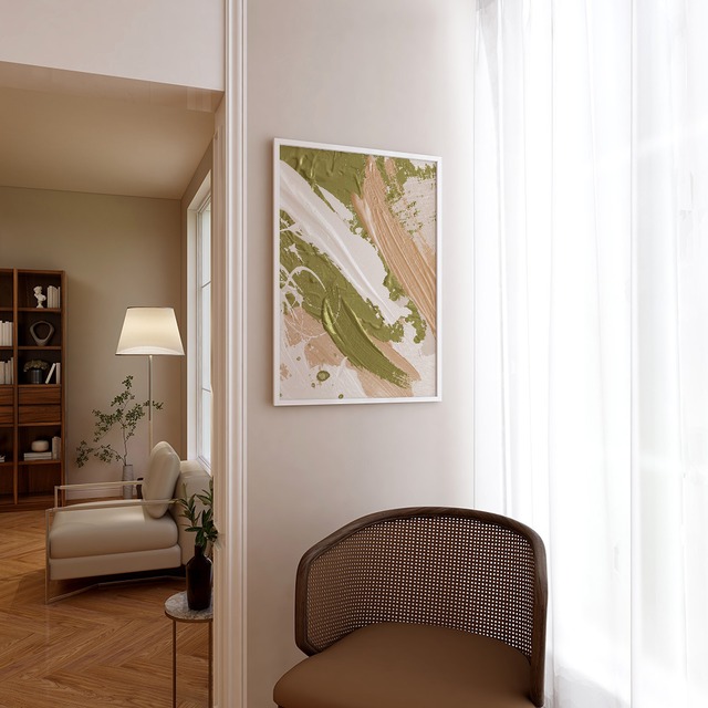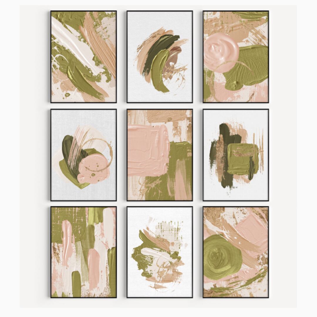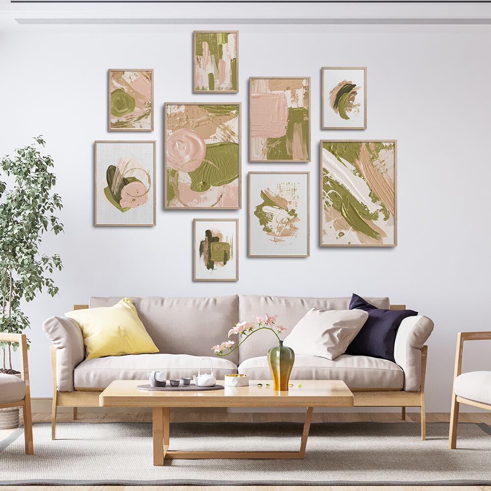 淡いピンクとグリーンでペイントされた抽象画です。全面に絵柄があるタイプと、キャンバス地を背景に小さめに抽象画が描かれているタイプがあります。春の草花を思わせる明るい色合いです。