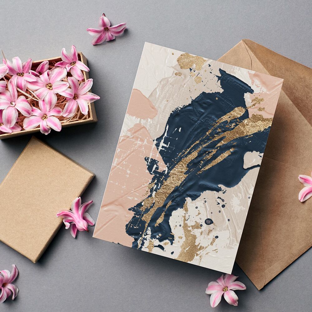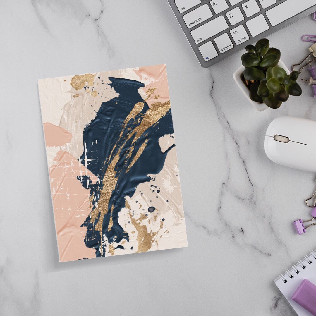 淡いピンクとネイビーでペイントされた抽象画です。全面に絵柄があるタイプと、キャンバス地を背景に小さめに抽象画が描かれているタイプがあります。