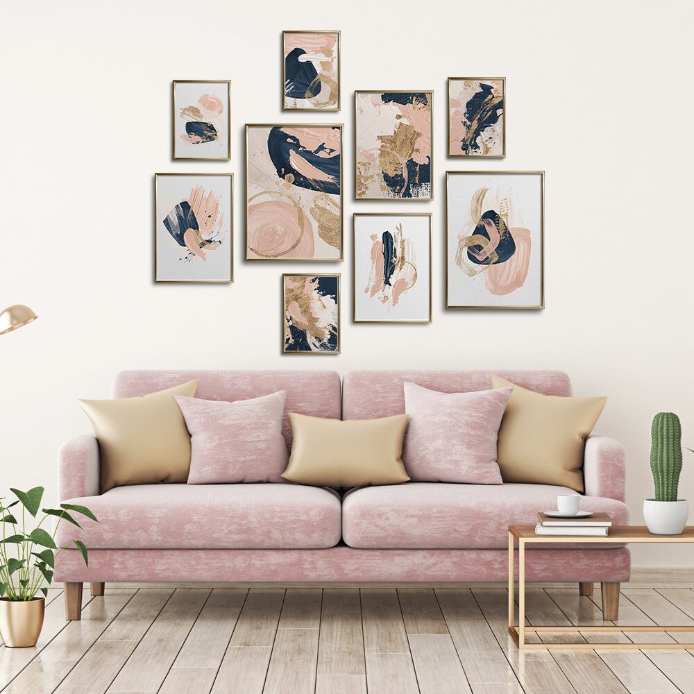 淡いピンクとネイビーでペイントされた抽象画です。全面に絵柄があるタイプと、キャンバス地を背景に小さめに抽象画が描かれているタイプがあります。