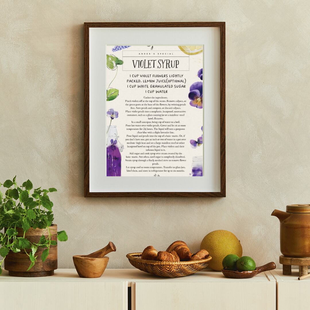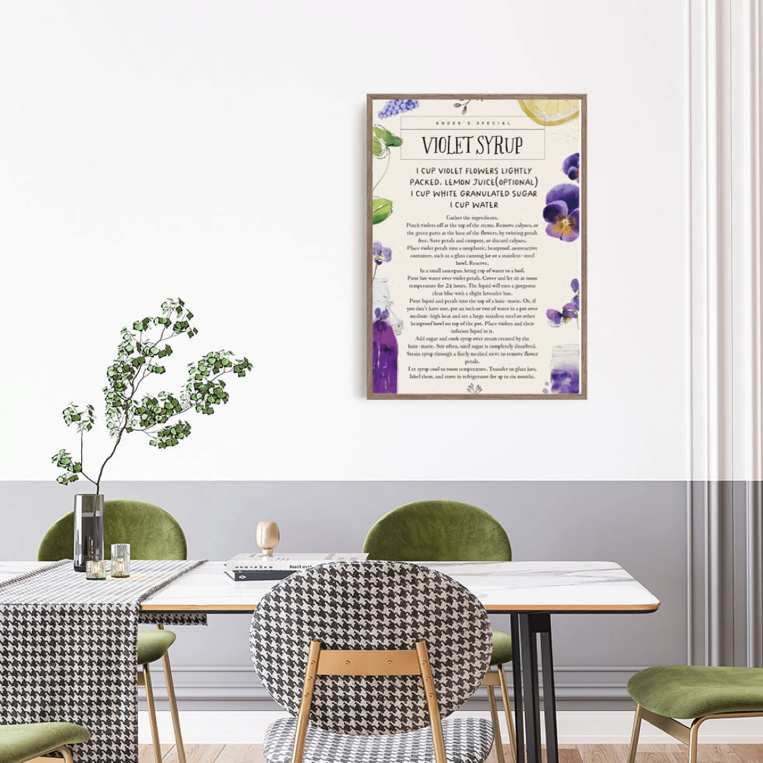 スミレやタンポポ、ライラックやエルダーフラワーなどの春の草花やハーブのボタニカルポスターです。素朴な絵のタッチと英文が、キッチンをおしゃれに彩ります。同じシリーズの植物のレシピポスターとの相性も良いので、合わせて飾るのもおすすめです。