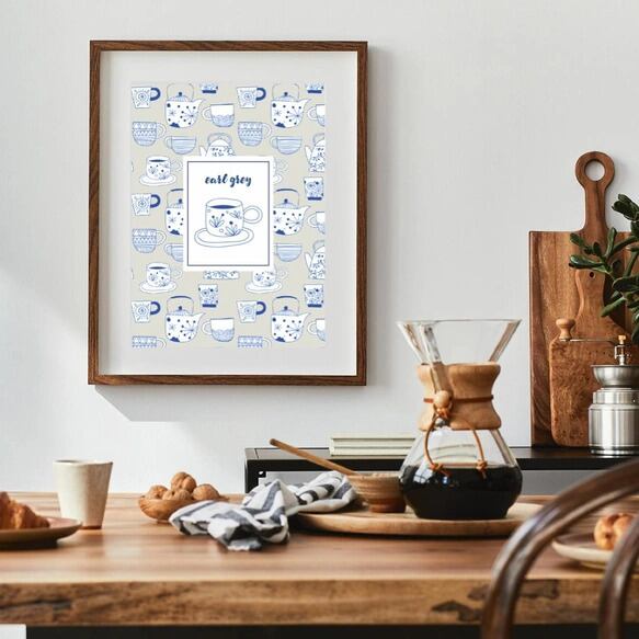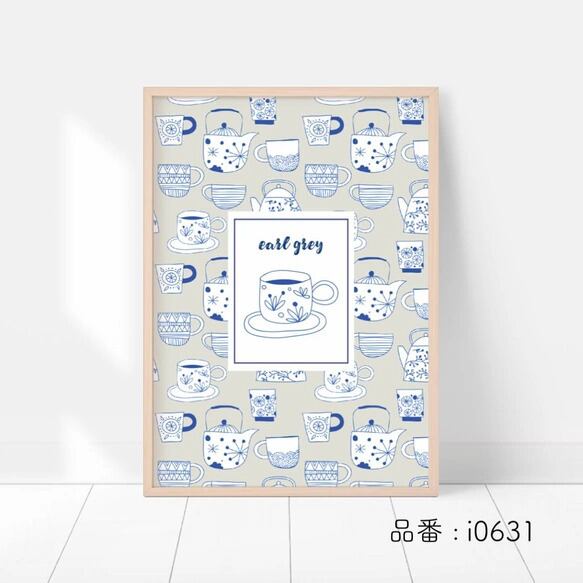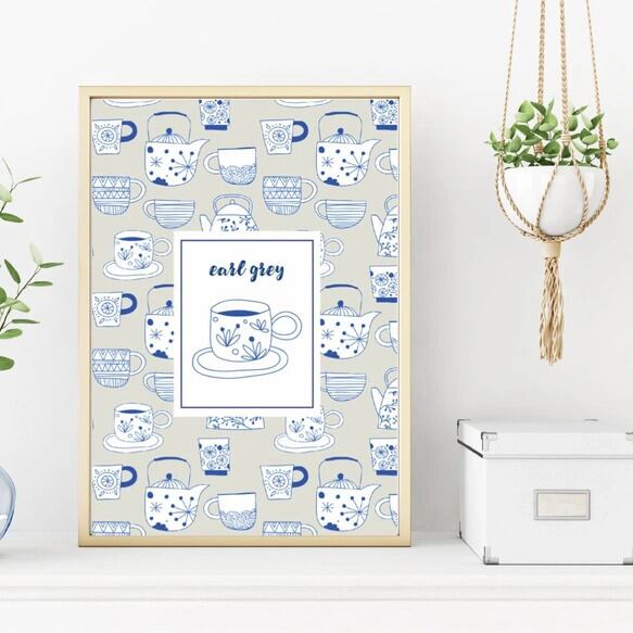 北欧雑貨のポスターです。北欧ならではの、紺色とグレーをベースにした色合いです。ティーポットやティーカップ、魚、花、フルーツなど、さまざまなモチーフをアレンジしました。北欧テイストが好きな方におすすめです。
