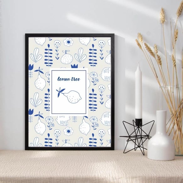 北欧雑貨のポスターです。北欧ならではの、紺色とグレーをベースにした色合いです。ティーポットやティーカップ、魚、花、フルーツなど、さまざまなモチーフをアレンジしました。北欧テイストが好きな方におすすめです。