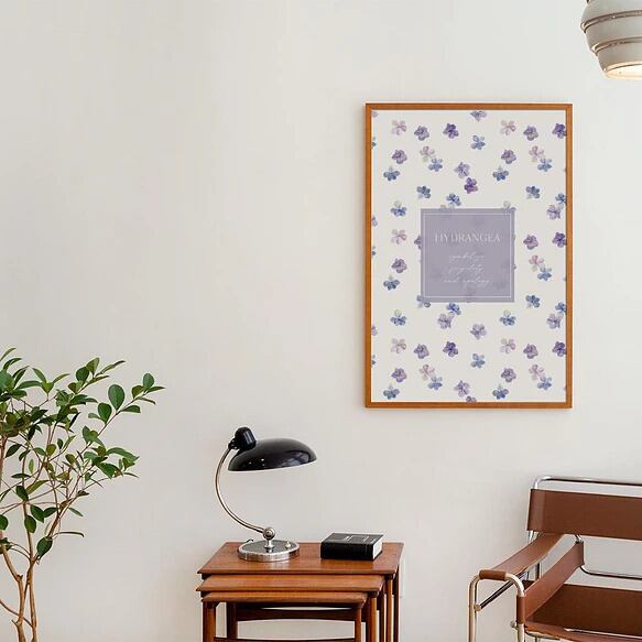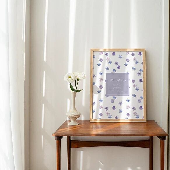 初夏のあじさいのポスターです。青と紫の紫陽花をモチーフにしました。背景は真っ白ではなく、でこぼこした紙やキャンバス地のような素材を使用して、ナチュラル感のある優しい雰囲気に仕上げました。小さい花を散りばめた総柄タイプもおすすめです。