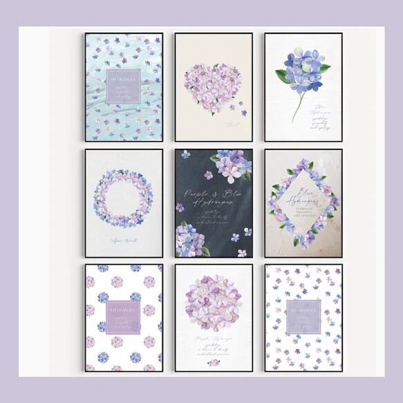 初夏のあじさいのポスターです。青と紫の紫陽花をモチーフにしました。背景は真っ白ではなく、でこぼこした紙やキャンバス地のような素材を使用して、ナチュラル感のある優しい雰囲気に仕上げました。小さい花を散りばめた総柄タイプもおすすめです。