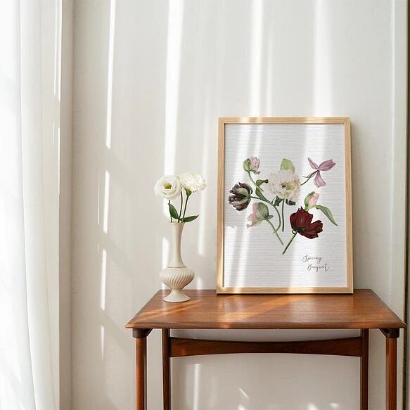 春のボタニカルブーケのポスターです。春から初夏の庭を彩る、チューリップやバラ、ポピーなどの花がダイナミックに描かれています。パステル調にボルドーを効かせた色合いで、とても品の良い、大人っぽい雰囲気にまとまっています。複数枚並べて飾るのも良いと思います。