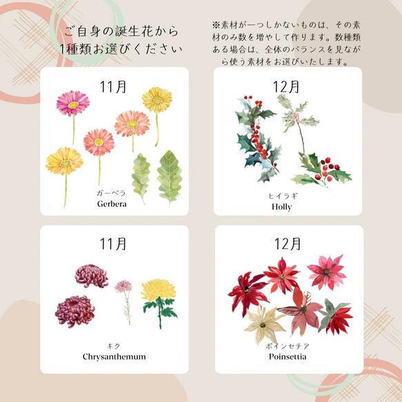 毎月2つずつ誕生花がありますので、ご希望のものをお選びいただけます。