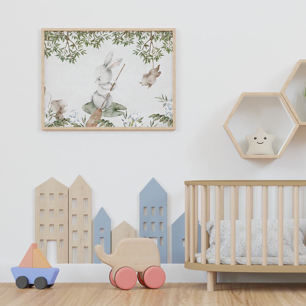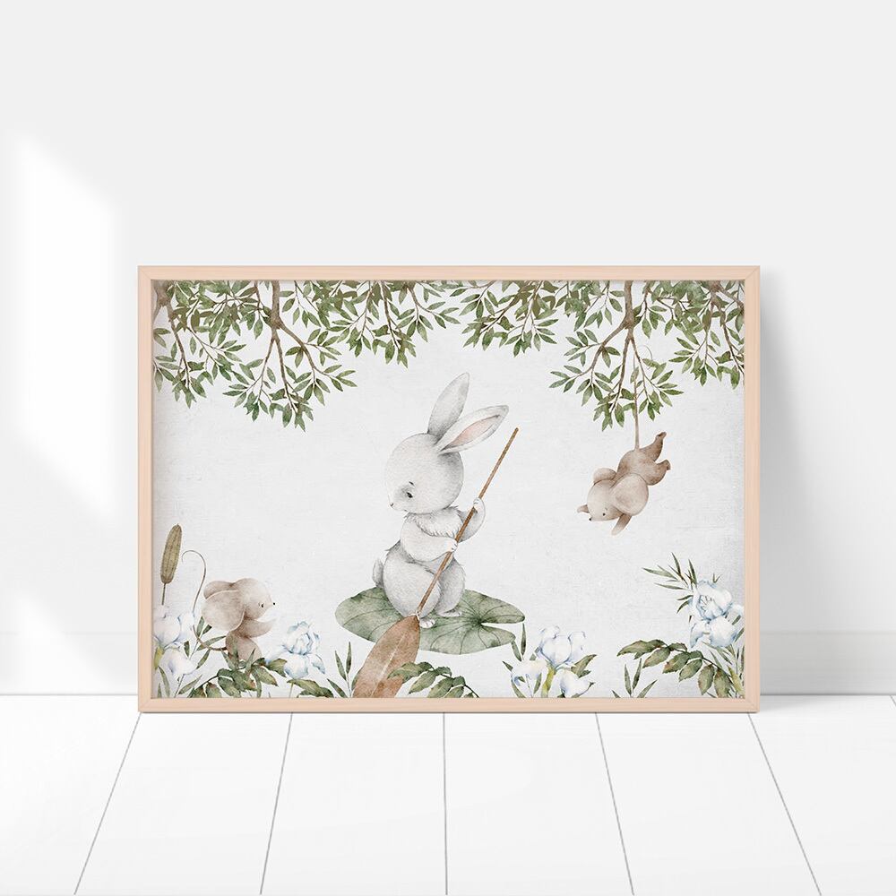 湖で遊ぶ白鳥、ウサギ、ネズミたちのポスターです。藤や蓮の花、柳やアヤメなどの自然の風景と共に優しく繊細なタッチで描かれていて、まるで絵本の中にいるような世界観です。子供部屋にもいかがでしょうか。