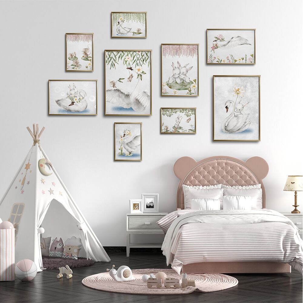 湖で遊ぶ白鳥、ウサギ、ネズミたちのポスターです。藤や蓮の花、柳やアヤメなどの自然の風景と共に優しく繊細なタッチで描かれていて、まるで絵本の中にいるような世界観です。子供部屋にもいかがでしょうか。