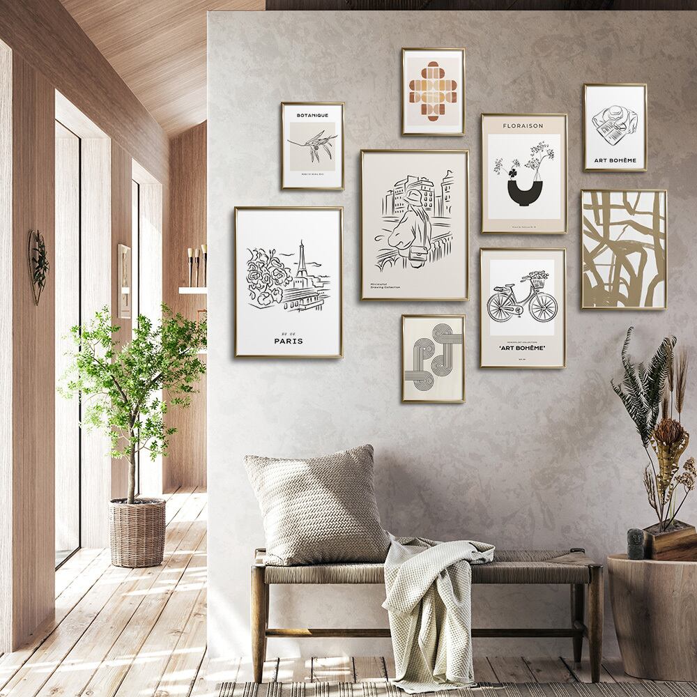モダンアートのポスターです。女性のイラストや植物、電話、靴、抽象的な形まで、さまざまなタイプのアートを取り揃えました。黒、白、ベージュ、ブラウンの色味で揃えているので、何枚か選んで飾っても、統一感のあるおしゃれな雰囲気が作れます。