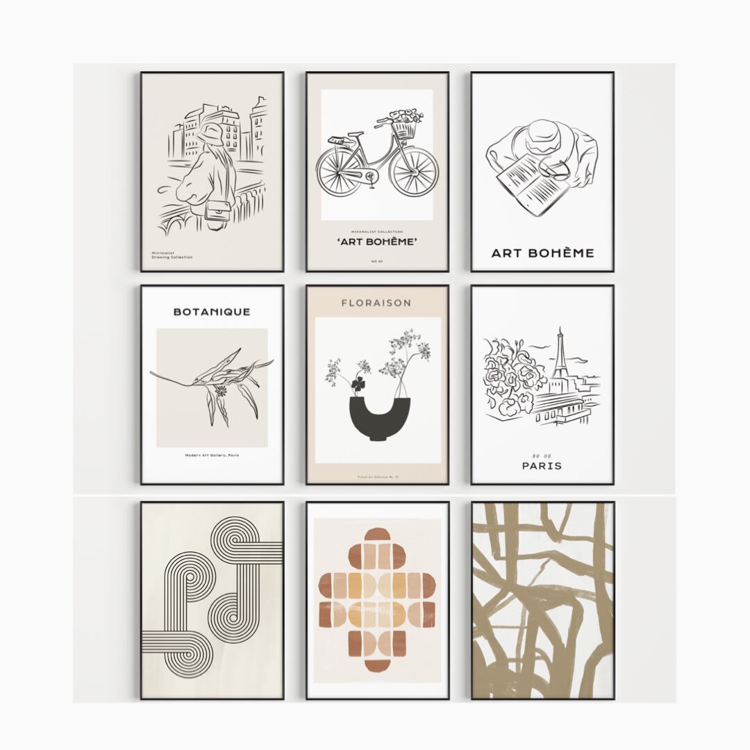 モダンアートのポスターです。女性のイラストや植物、電話、靴、抽象的な形まで、さまざまなタイプのアートを取り揃えました。黒、白、ベージュ、ブラウンの色味で揃えているので、何枚か選んで飾っても、統一感のあるおしゃれな雰囲気が作れます。