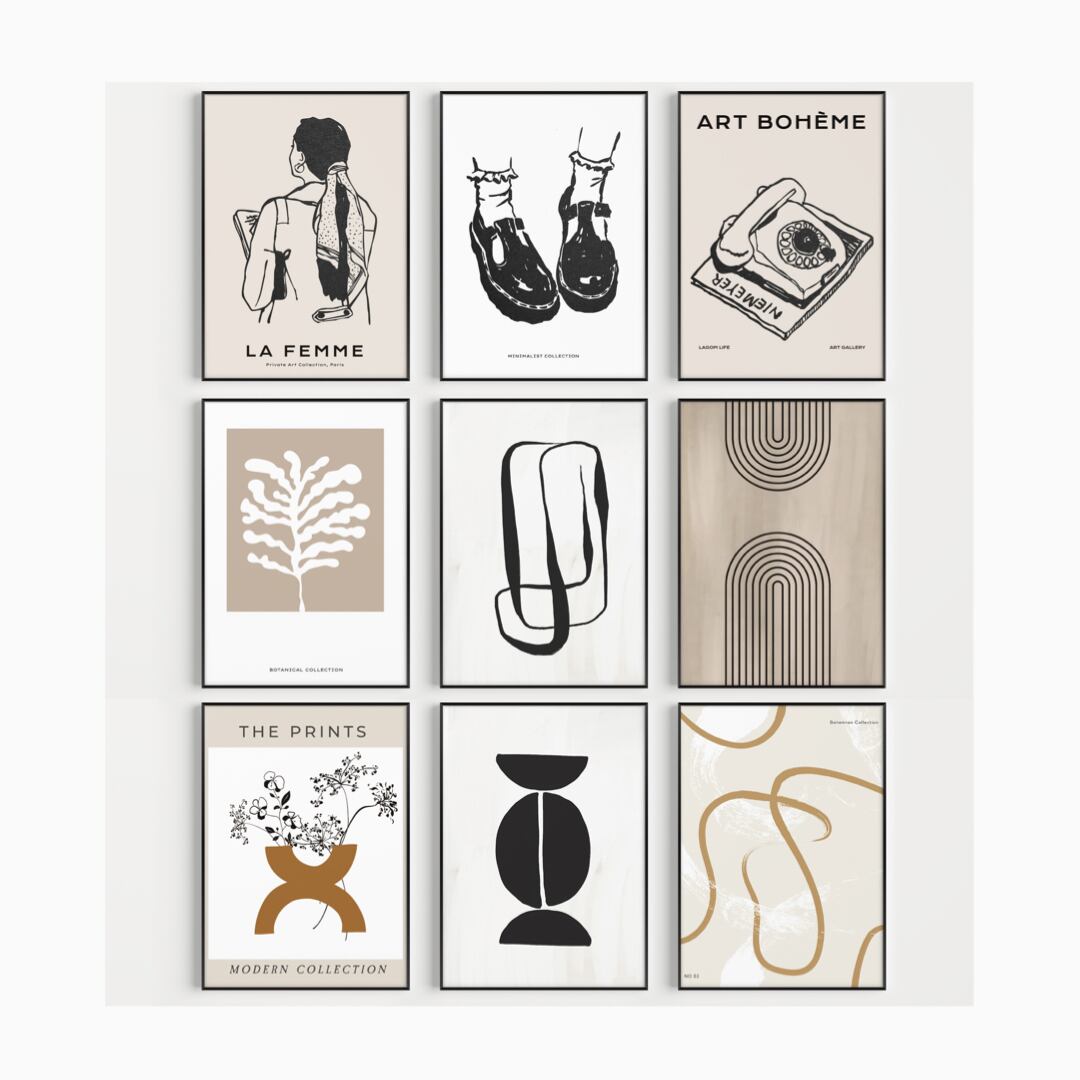 モダンアートのポスターです。女性のイラストや植物、電話、靴、抽象的な形まで、さまざまなタイプのアートを取り揃えました。黒、白、ベージュ、ブラウンの色味で揃えているので、何枚か選んで飾っても、統一感のあるおしゃれな雰囲気が作れます。