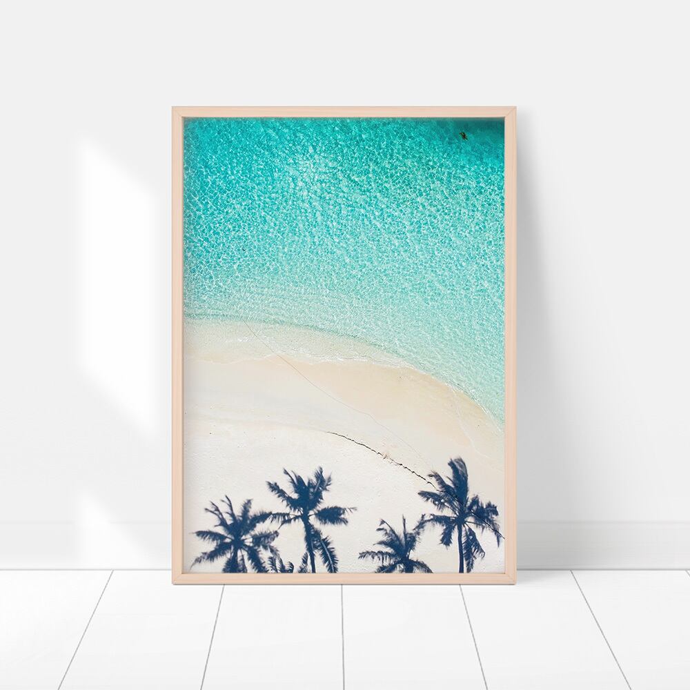 夏の海の風景写真のポスターです。青い海やビーチパラソル、砂浜に続く道、ヤシの木などの海の景色をたくさんセレクトしました。エメラルドグリーンに輝く夏の景色を、お部屋に取り入れてみてはいかがでしょうか。