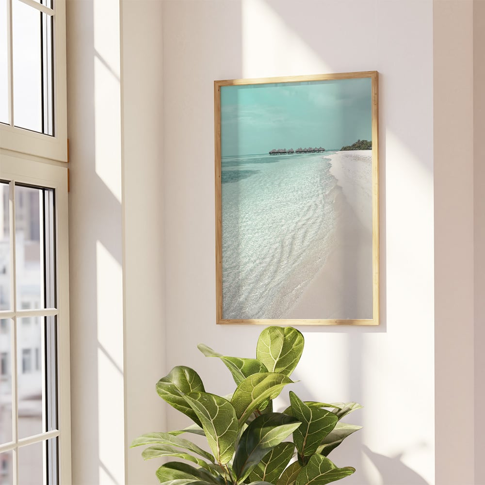 夏の海の風景写真のポスターです。青い海やビーチパラソル、砂浜に続く道、ヤシの木などの海の景色をたくさんセレクトしました。エメラルドグリーンに輝く夏の景色を、お部屋に取り入れてみてはいかがでしょうか。