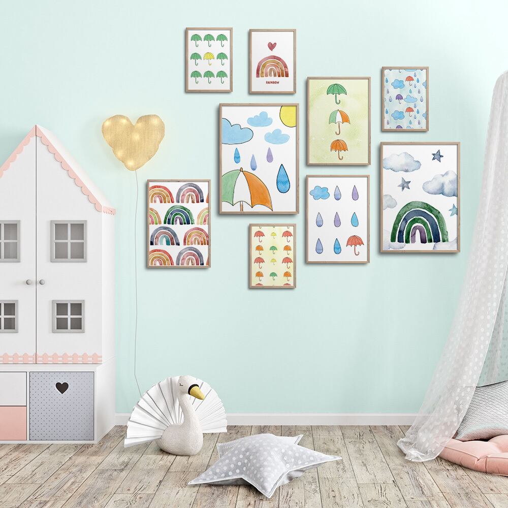 梅雨の季節に合わせて、傘や雨、虹のモチーフのポスターをご用意しました。赤、青、緑に黄色、とてもカラフルで元気が出るイラストです。子供部屋にもいかがでしょうか。