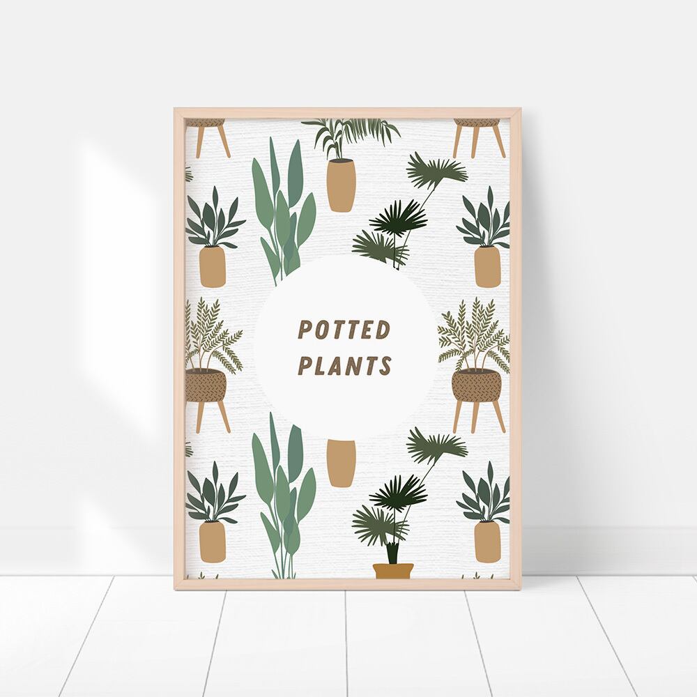 夏のインテリアグリーンのポスターです。さまざまなタイプの葉がポットに入っているデザインで、涼しげな雰囲気になります。