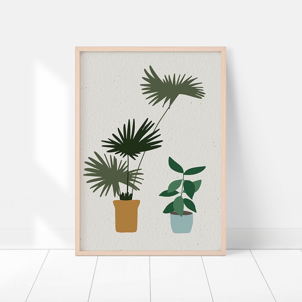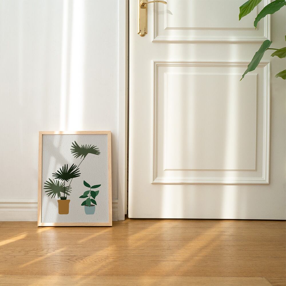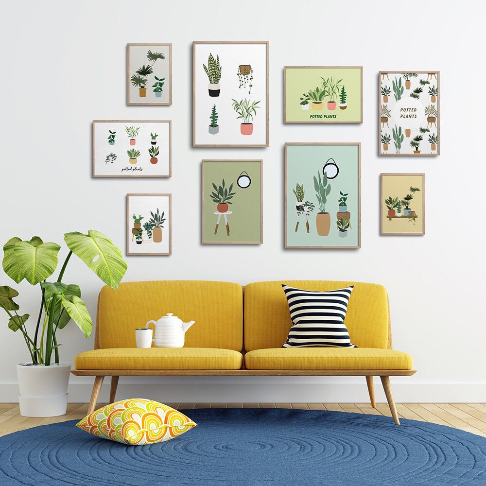 夏のインテリアグリーンのポスターです。さまざまなタイプの葉がポットに入っているデザインで、涼しげな雰囲気になります。