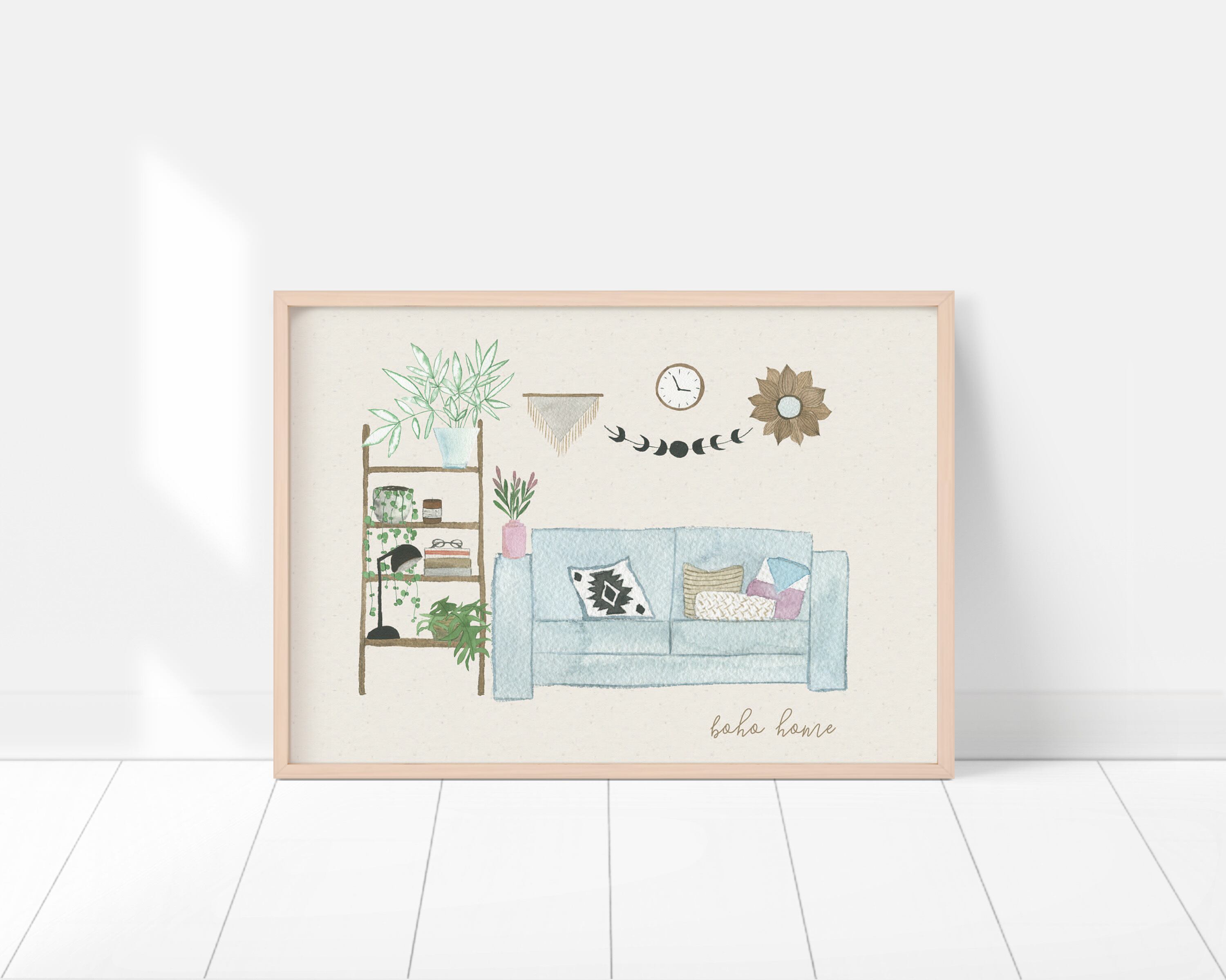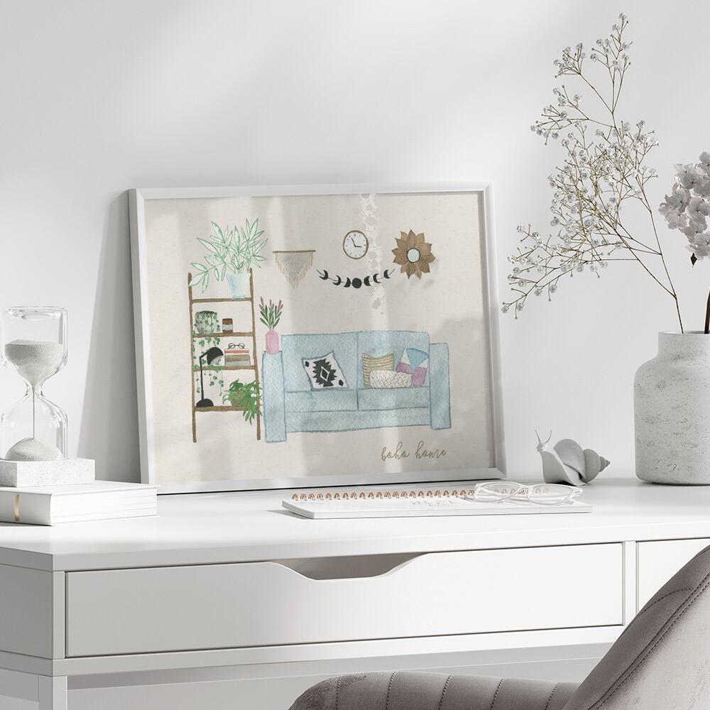 夏のインテリアのポスターです。ソファーやベッド、棚やインテリア雑貨に、観葉植物が飾られています。涼しげでリラックスした雰囲気を出してくれるポスターです。