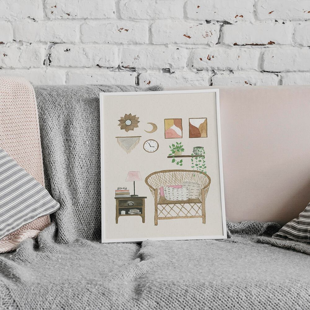 夏のインテリアのポスターです。ソファーやベッド、棚やインテリア雑貨に、観葉植物が飾られています。涼しげでリラックスした雰囲気を出してくれるポスターです。