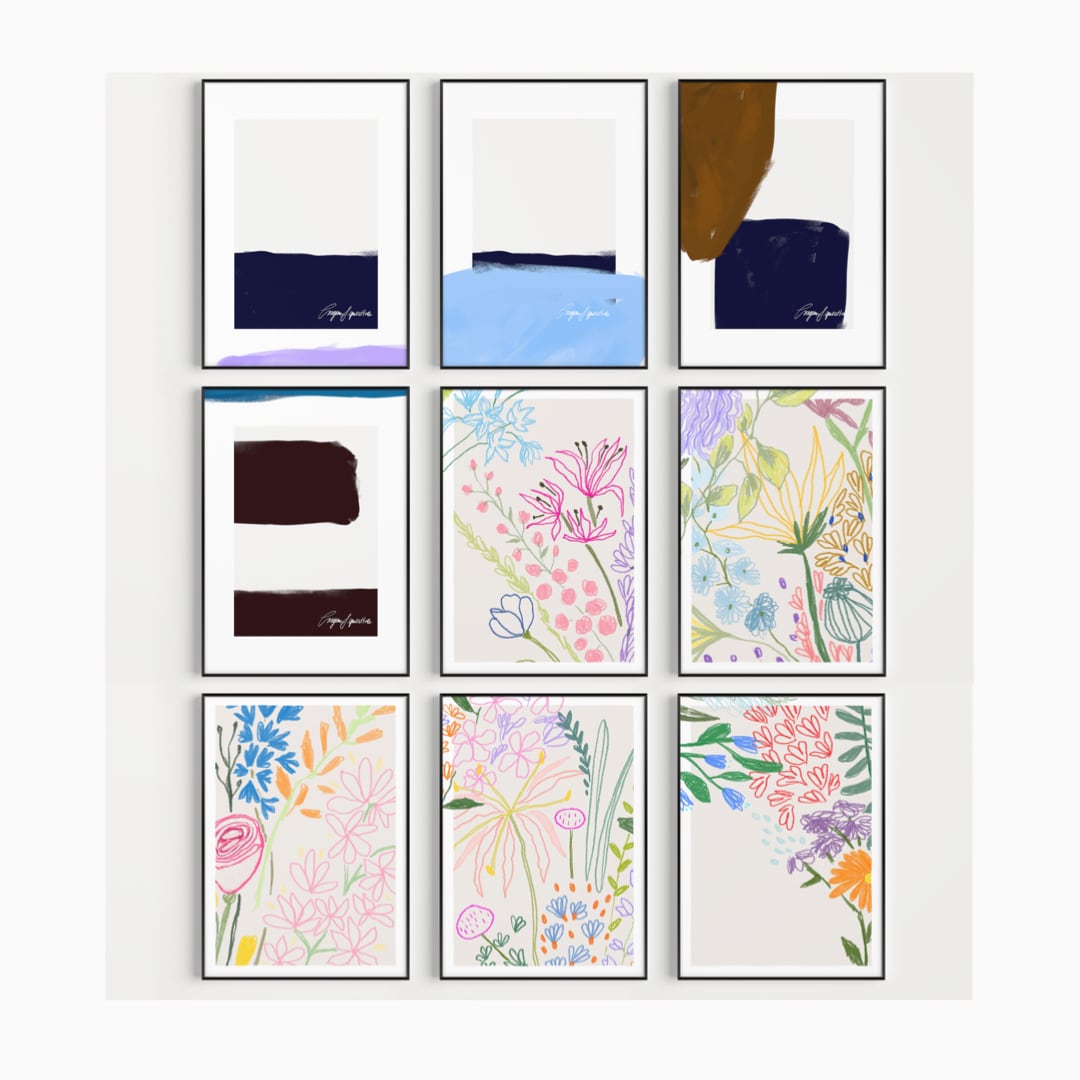 夏にぴったりな、カラフルなパステルのポスターです。ピンク、きみどり、水色、紫などのカラフルでポップな色合いの花の絵のポスターと、水色や黒、茶色をベースにしたシンプルモダンなデザインのポスターがあります。