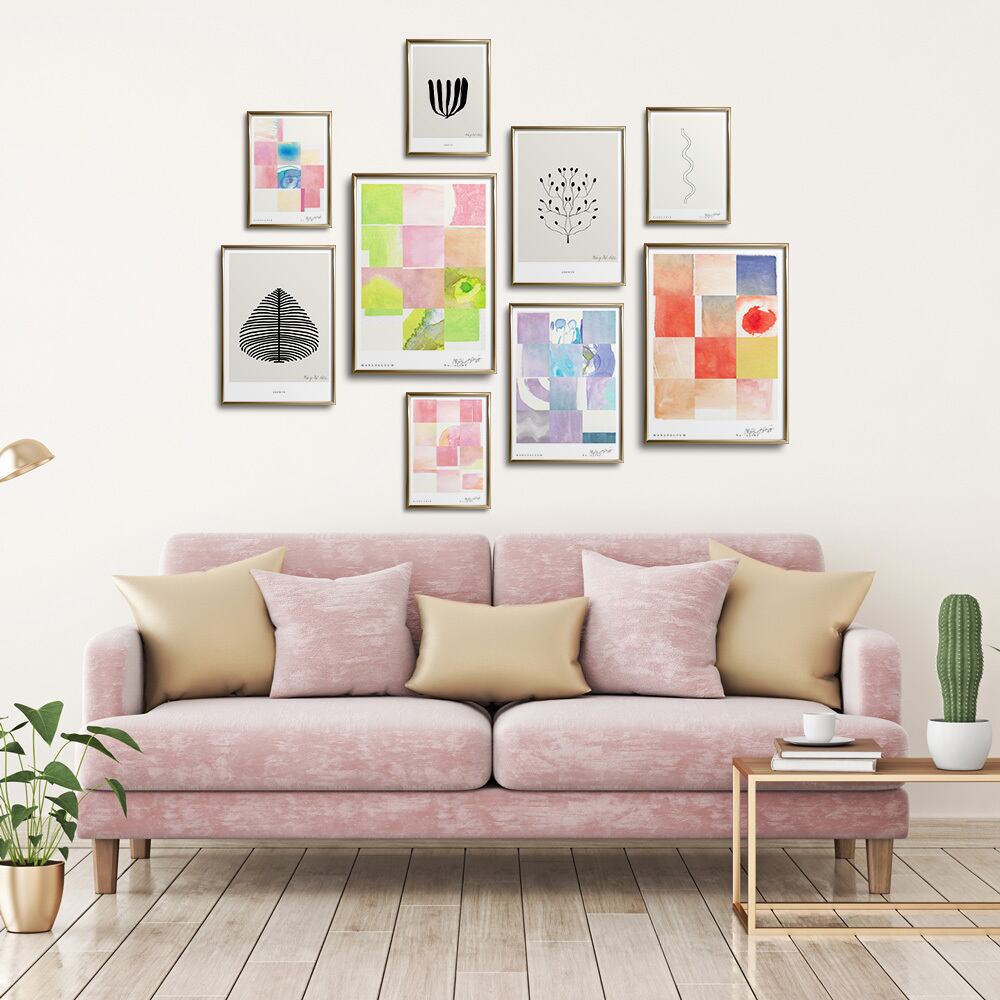 夏にぴったりな、カラフルな抽象画のポスターです。ブルー、黄緑、ピンク、赤みが混ざったものなど、ポップな水彩の四角形が並んでいるデザインです。また、植物を抽象画にしたものも、組み合わせて飾るとモダンな雰囲気になります。