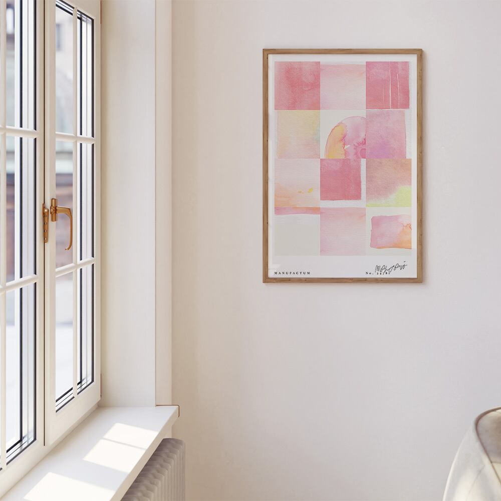 夏にぴったりな、カラフルな抽象画のポスターです。ブルー、黄緑、ピンク、赤みが混ざったものなど、ポップな水彩の四角形が並んでいるデザインです。また、植物を抽象画にしたものも、組み合わせて飾るとモダンな雰囲気になります。